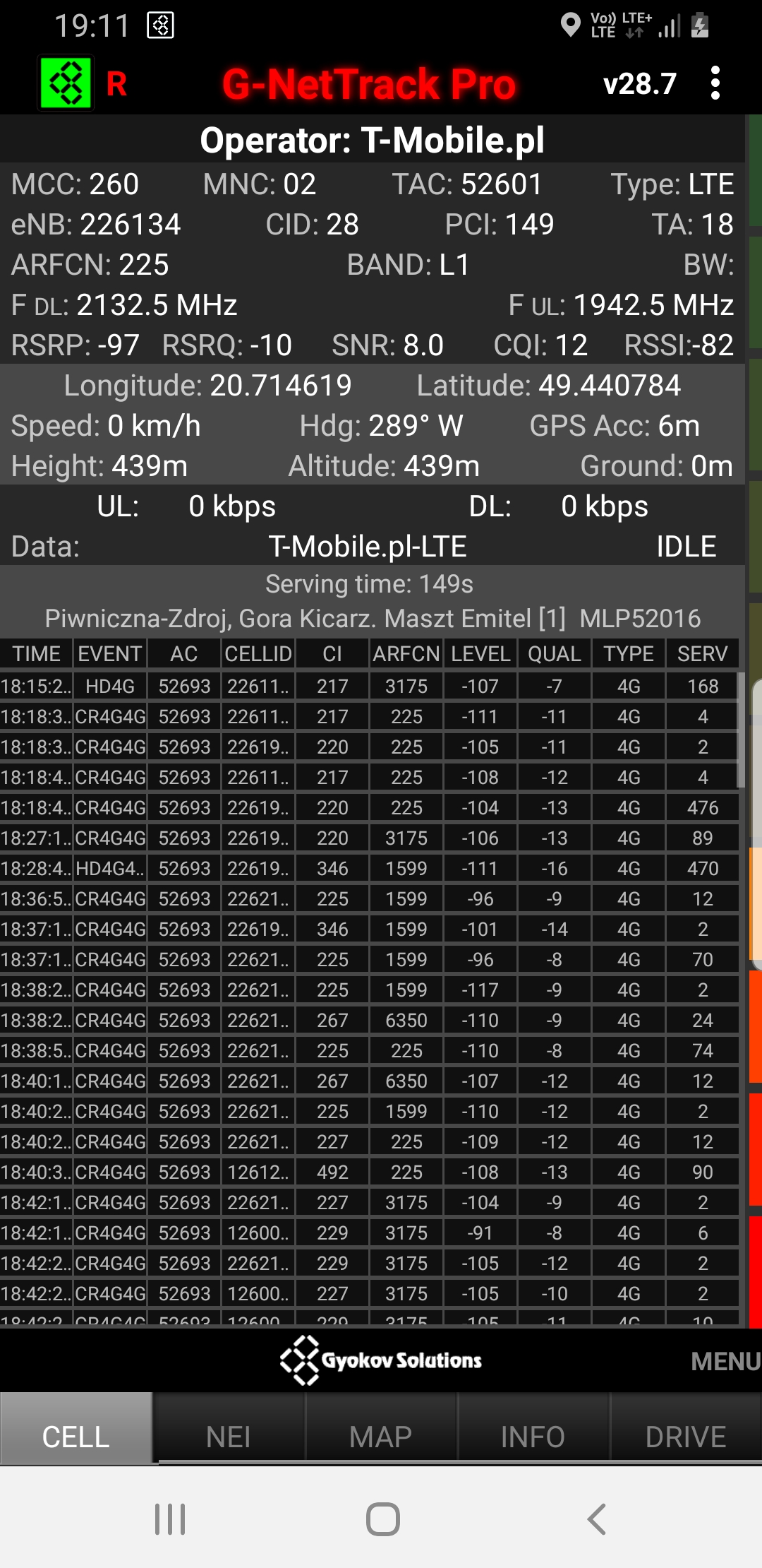Kolejny raz zapraszamy do zdrojowej miejscowości województwa małopolskiego. Tym razem nasz redakcyjny Kolega dotarł do Piwnicznej-Zdrój. W centrum sygnał sieci oferowany jest ze stacji bazowej na wzgórzu ponad miastem, na maszcie Emitela. Wyniki pomiarów w segmencie LTE dla sieci T-Mobile oraz Plus wyglądają jak niżej.