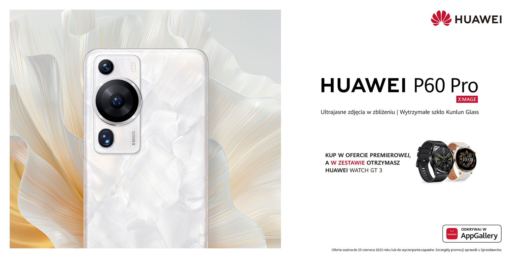 Warszawa, 2 czerwca 2023 r. – Huawei CBG Polska przedłuża ofertę premierową na zakup najnowszego HUAWEI P60 Pro. Smartfon zadebiutował w Polsce 9 maja 2023 r. i od tego dnia dostępny jest w specjalnej ofercie premierowej, w ramach której pierwsi kupujący mogą wraz z telefonem otrzymać smartwatch HUAWEI Watch GT 3 (w wersji 46 mm lub 42 mm). Oferta zostaje przedłużona do 25 czerwca 2023 r. Przedłużenie jest odpowiedzią na rosnące zainteresowanie, będące wynikiem trwającej kampanii telewizyjnej, oraz pełną dostępność produktów u partnerów biznesowych Huawei: operatorów sieci Plus, jak również w sklepach sieci Media Expert, Media Markt, RTV Euro AGD, x-kom, Komputronik i Neonet, w oficjalnej Strefie Marki na Allegro oraz na platformie Amazon.