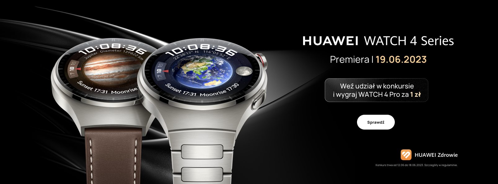 Warszawa, 12 czerwca 2023 r. – Już 19 czerwca br. na polskim rynku zadebiutują najnowsze inteligentne zegarki HUAWEI WATCH 4 oraz HUAWEI WATCH 4 Pro. Z tej okazji oficjalny sklep internetowy huawei.pl rozpoczyna wielkie odliczanie do ich premiery i zaprasza do udziału w konkursie, który potrwa do 18 czerwca br. Jego zwycięzca otrzyma HUAWEI WATCH 4 Pro w wersji Elite, a w ramach dwóch kolejnych nagród przewidziano innowacyjne zegarki 2‑w‑1 – HUAWEI WATCH Buds. Na wszystkich uczestników czeka rabat w wysokości 150 zł na zakup smartwatcha z serii HUAWEI WATCH 4.