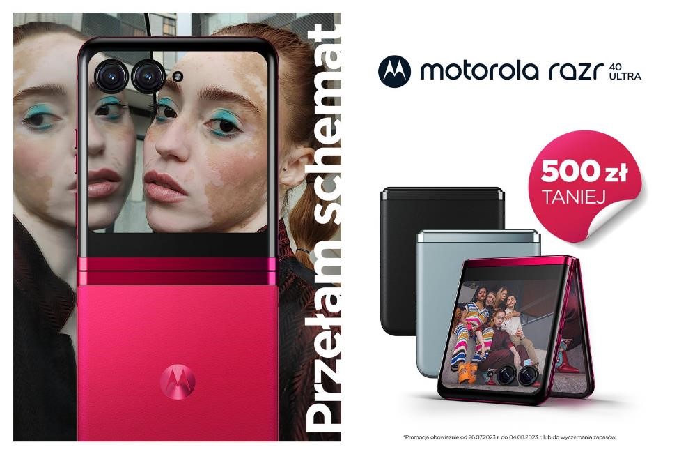 26 czerwca 2023 r.: Wystartowała promocja na smartfon motorola razr 40 ultra. Jeden z najbardziej rozpoznawalnych smartfonów z klapką przez najbliższe kilka dni będzie można nabyć w cenie 4999 zł. Promocja „500 zł taniej” potrwa do 4 sierpnia lub do wyczerpania zapasów. Model razr 40 ultra to najnowszy składany flagowiec firmy Motorola, wyróżniający się w pełni funkcjonalnym zewnętrznym wyświetlaczem pOLED 3,6”, na którym można uruchamiać aplikacje mobilne. Smartfon cechuje się również eleganckim wzornictwem oraz niepowtarzalną kolorystyką Pantone® – dostępny jest między innymi w edycji Viva Magenta (kolor roku 2023), z obudową wykończoną piękną i praktyczną skórą wegańską.