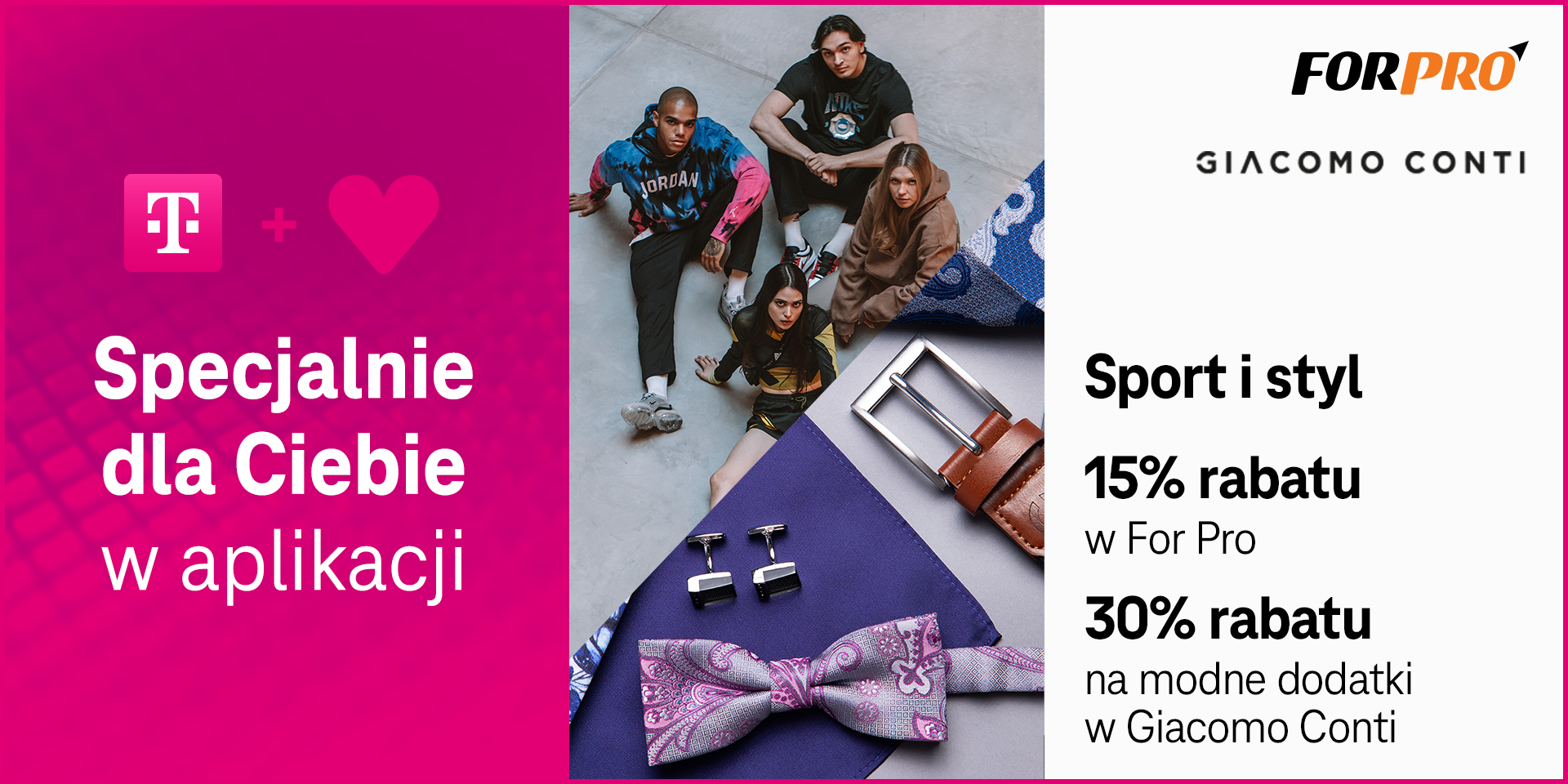 Wakacyjne słońce w wielu z nas budzi chęć do aktywnego spędzania czasu. Właśnie dlatego w ramach kolejnej odsłony akcji „Bonusy od serca” w T-Mobile przygotowaliśmy dla naszych klientów 15% rabatu w sklepie internetowym i stacjonarnym ForPro na produkty marek adidas, New Balance, Nike oraz Skechers. Z kolei na osoby, które rozważają zakup garderoby męskiej, czeka aż 30% zniżki na dodatki w Giacomo Conti, do wykorzystania zarówno w przypadku zakupów na miejscu, jak i online. Prezenty są dostępne w aplikacji „Mój T‑Mobile” do 9 sierpnia. Ciepłe i wyjątkowo długie dni skłaniają do wyjścia z domu, spacerów, treningów na świeżym powietrzu czy aktywnego wypoczynku. Wygodna, oddychająca odzież i obuwie są przy tym nieodzowne, jeśli czas chcemy spędzić nie tylko na sportowo, ale też przyjemnie. Dlatego dla klientów T‑Mobile przygotowaliśmy 15-procentowy rabat do sklepu ForPro, który jest oficjalnym partnerem marek takich jak Nike, adidas czy New Balance. Zniżkę można wykorzystać w sklepie przy ul. Klimczaka 1 w Warszawie albo na stronie internetowej https://www.forpro.pl/ podczas składania zamówienia.