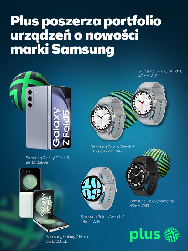 W ofercie Plusa pojawiły się najnowsze urządzenia marki Samsung, w tym dwa smartfony: Galaxy Z Flip 5 5G, Galaxy Z Fold 5 5G oraz dwa smartwatche: Galaxy Watch6 i Galaxy Watch6 Classic. Do 10 sierpnia trwa promocja, w której można kupić Samsung Galaxy Z Flip 5 5G 512 GB lub Samsung Galaxy Z Fold 5 5G 512 GB w cenie tego samego modelu z mniejszą pamięcią oraz zwrot na przedpłaconą kartę Visa w wysokości nawet 450 złotych, a do 28 lipca można otrzymać słuchawki Samsung Buds 2 w prezencie.