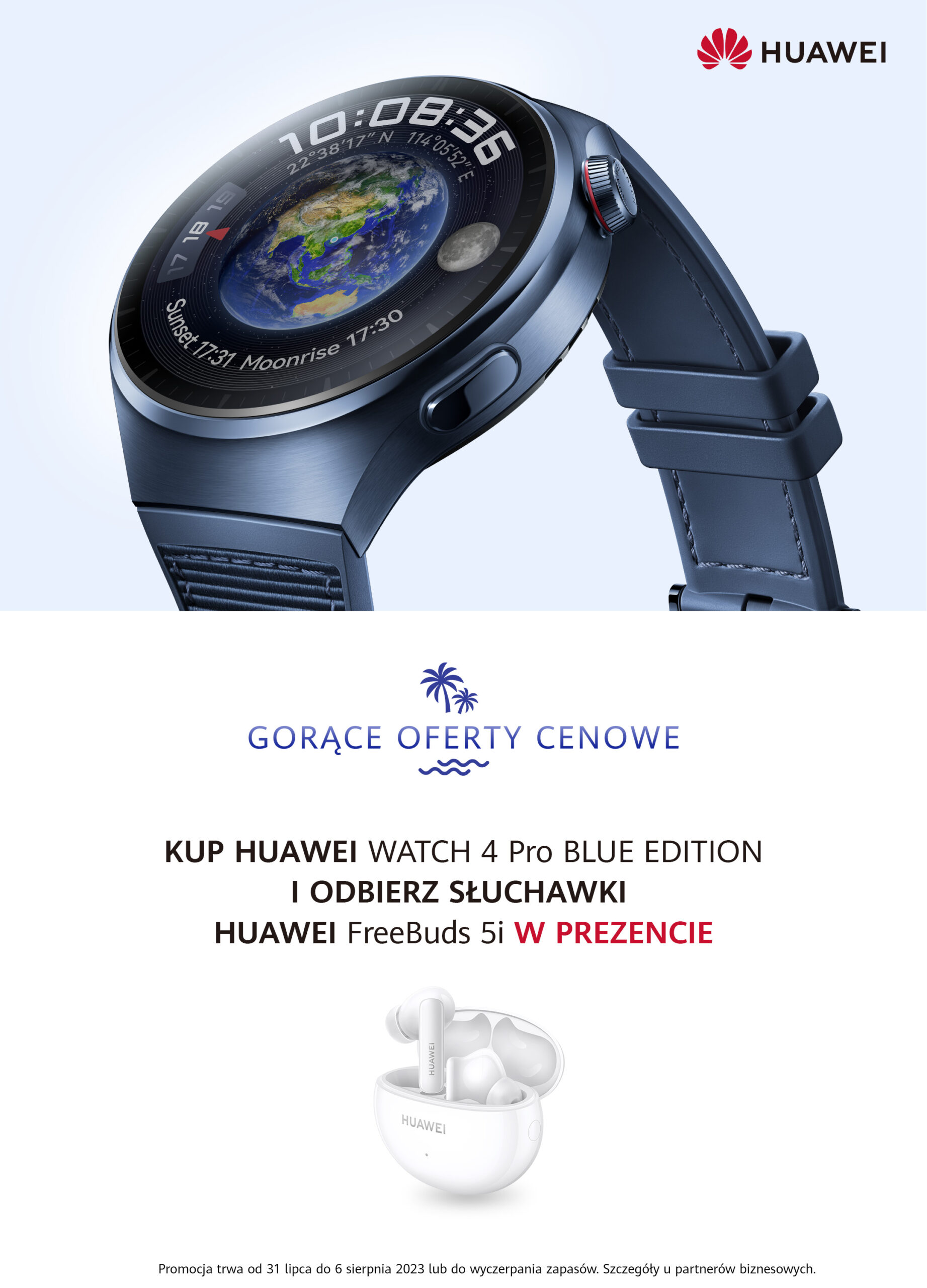 Sugerowana cena detaliczna HUAWEI WATCH 4 Pro Blue Edition wynosi 2399 zł. Smartwatch będzie dostępny od 31 lipca 2023 r., a z okazji wejścia do sprzedaży, w okresie do 6 sierpnia 2023 r., przy jego zakupie będzie można otrzymać słuchawki HUAWEI FreeBuds 5i w prezencie (lub za 1 zł). Urządzenie będzie dostępne u partnerów biznesowych Huawei, w sieciach handlowych Media Expert, RTV Euro AGD, Media Markt, x-kom i Komputronik , a także w Strefie Marki na Allegro oraz na Huawei.pl.