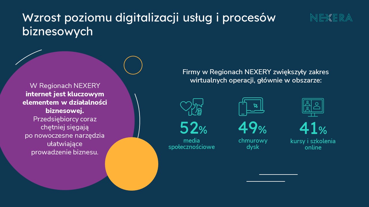 – Według raportu #RegionyNEXERY2023 firmy zwiększyły zakres wirtualnych operacji, głównie w obszarze prowadzenia własnych profili w mediach społecznościowych (z 37 proc. w 2022 r. do 52 proc. w 2023 r.) oraz korzystania z chmurowego dysku (z 44 proc. w 2022 r. do 49 proc. w 2023 r.).