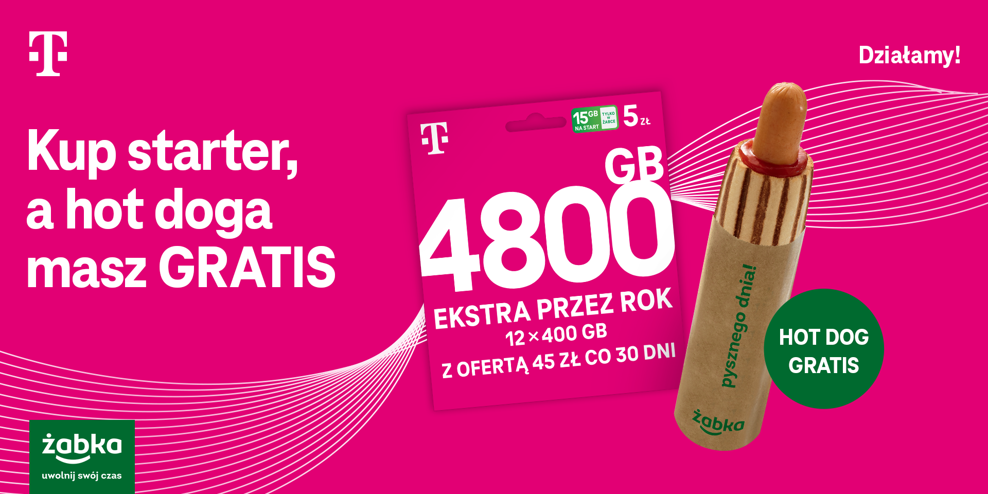 Kup w sklepie Żabka starter T-Mobile na kartę z 4800 GB ekstra przez rok i odbierz w prezencie hot-doga. W domu, w podróży, a czasem na działce – wakacje możemy spędzać w rozmaity sposób. Dobrze przy tym, gdy – niezależnie od miejsca i aktywności – towarzyszy nam dobra rozrywka, a tej dostarczyć nam może np. solidny zapas internetu. Z pewnością nie zabraknie go użytkownikom T-Mobile na kartę, którzy mogą skorzystać z promocji 4800 GB ekstra przez 365 dni (12 x 400 GB). A teraz, w ramach kolejnej odsłony kampanii z siecią sklepów Żabka, osoby, które kupią dowolny starter na kartę w magentowej sieci, otrzymają bon na hot-doga w prezencie.