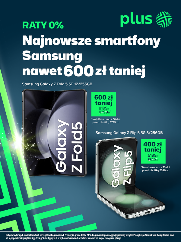 Początek roku szkolnego może być jeszcze lepszy dzięki ciekawej okazji dla fanów urządzeń marki Samsung. Plus oferuje niższe ceny smartfonów Samsung Galaxy Z Fold 5 5G oraz Samsung Galaxy Z Flip 5 5G dla klientów indywidualnych oraz firm. Dzięki temu klienci będą mogli zaoszczędzić nawet do 600 złotych (+ VAT). Całkowity koszt zakupu: