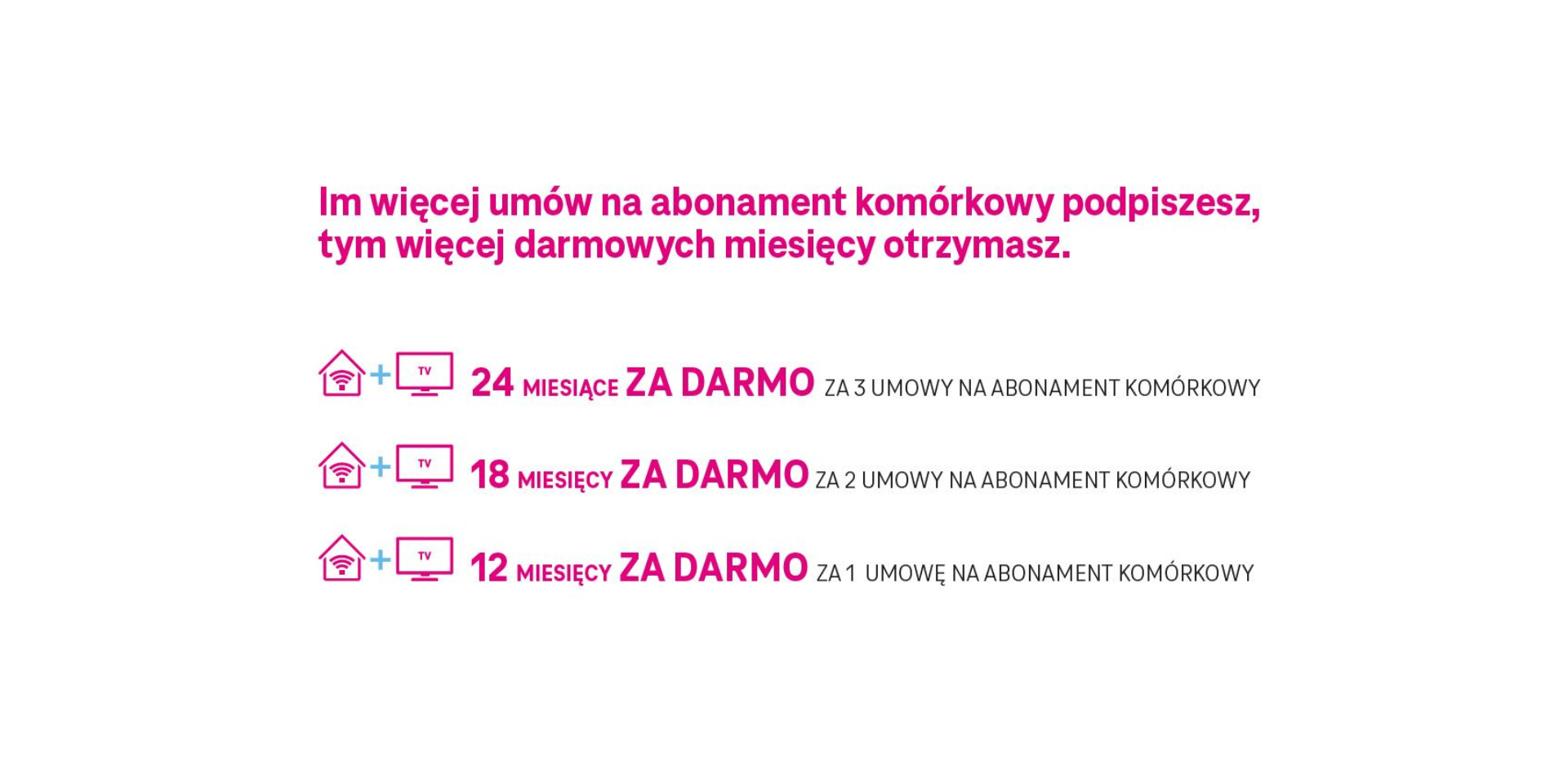 Przenosząc lub dokupując trzy abonamenty komórkowe w T-Mobile w taryfie „M Nielimitowana” (z nielimitowanymi rozmowami, SMS-ami, MMS-ami i nielimitowanym internetem z prędkością do 30 Mb/s) lub „L Nielimitowana” (z nielimitowanymi rozmowami, SMS-ami, MMS-ami i internetem bez limitu danych i prędkości), klienci przez dwa lata mogą cieszyć się internetem światłowodowym (300 Mb/s) oraz telewizją pakiet TV S za darmo. W ten sposób oszczędzają do 1560 zł w ciągu 24 miesięcy. Osoby, które zdecydują się przenieść lub dokupić dwa abonamenty komórkowe w taryfach „M Nielimitowana” lub „L Nielimitowana”, otrzymają telewizję pakiet TV S oraz światłowód 300Mb/s na 18 miesięcy za darmo. Z kolei przenosząc jeden numer do T-Mobile lub dokupując kolejny abonament w taryfie „M Nielimitowana”, bądź „L Nielimitowana”, otrzymamy telewizję pakiet TV S oraz internet światłowodowy 300 Mb/s przez 12 miesięcy za darmo.