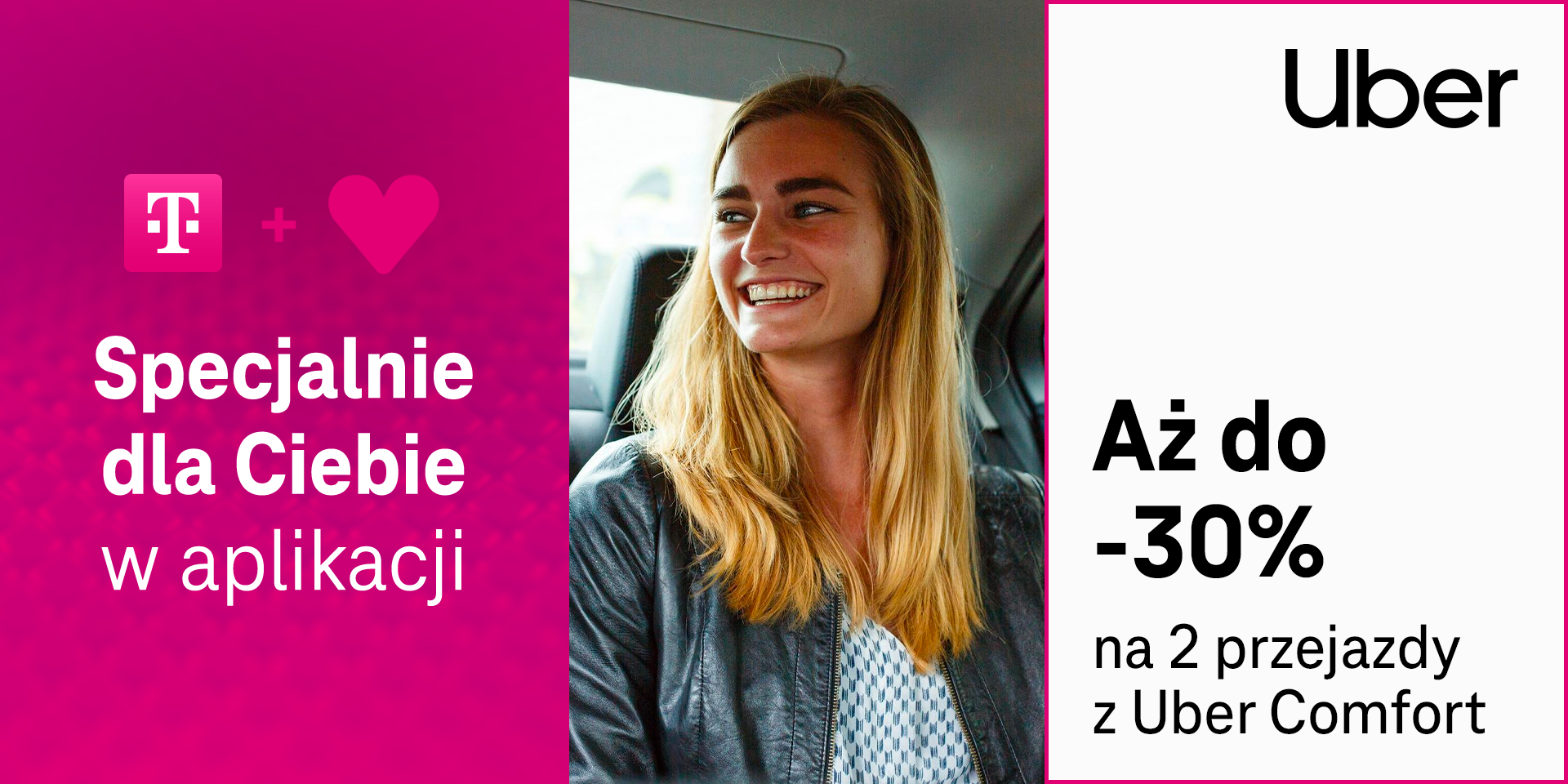 Gdy zależy nam na czasie i wygodzie w przemieszczaniu się po mieście, często korzystamy z aplikacji, które pozwalają sprawnie i bezpiecznie dotrzeć do wybranego punktu dzięki rozległej sieci pojazdów i kierowców. Jedną z najpopularniejszych jest Uber, który jest licencjonowanym pośrednikiem przy przewozie osób, współpracującym z partnerami posiadającymi licencję taksówkarską w 19 lokalizacjach w Polsce, m.in. w Warszawie, Krakowie, Poznaniu, Łodzi, Wrocławiu czy Trójmieście. Teraz dzięki unikalnemu kodowi rabatowemu, klienci T-Mobile mogą jeszcze taniej przemieścić się w określone miejsce, bowiem mamy dla nich do 30% zniżki na dwa przejazdy.