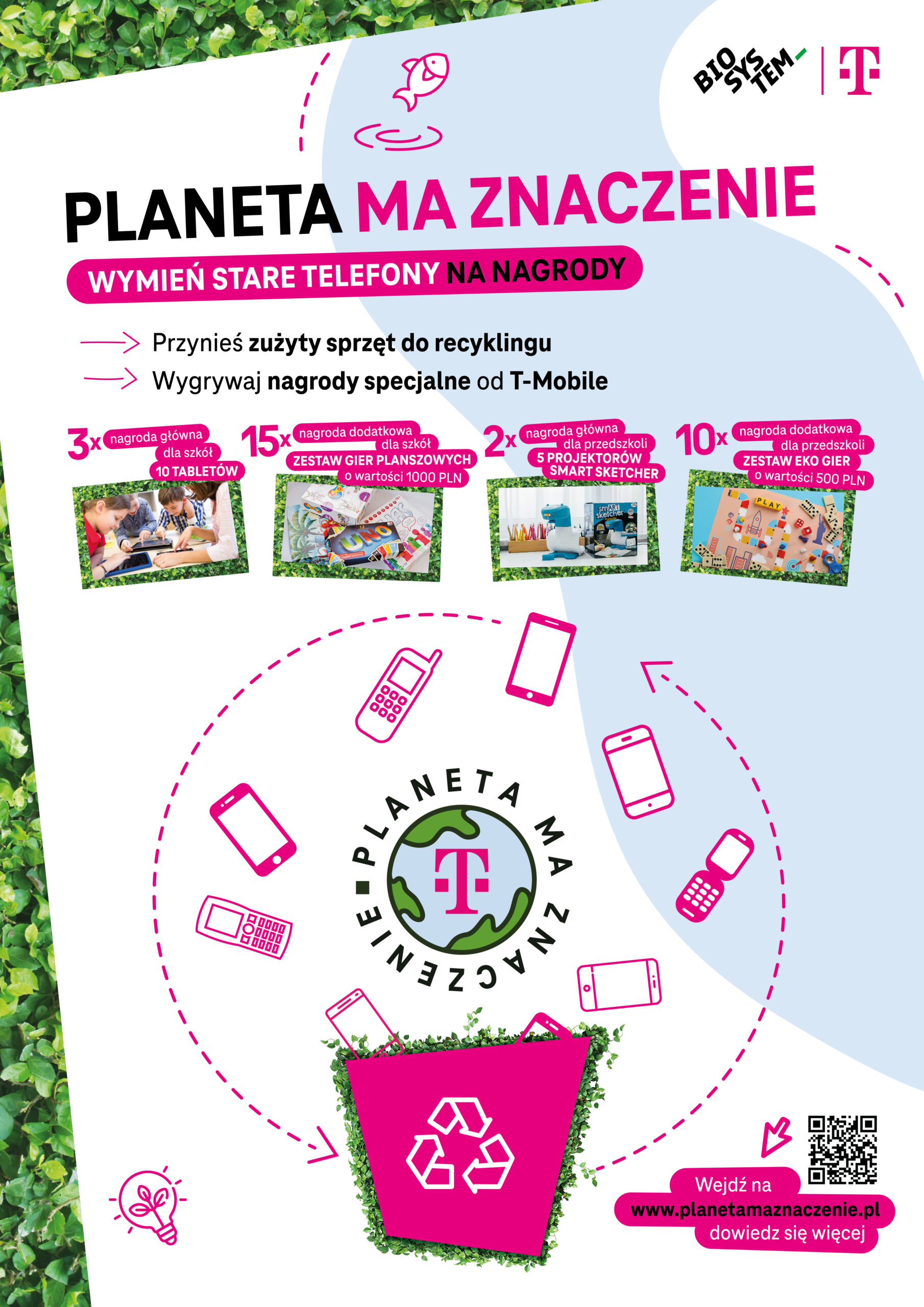 Czy stare urządzenia mobilne da się wymienić na atrakcyjne nagrody? W T-Mobile już po raz kolejny udowadniamy, że jest to możliwe! Wraz z rokiem szkolnym 2023/2024 startuje nowa edycja programu edukacyjnego „Zbieraj baterie i telefony”, w którym zaangażowani uczniowie i nauczyciele podstawówek i przedszkoli mogą podjąć ekologiczne wyzwanie. Za jego realizację zgarnąć zaś m.in. bony pieniężne czy zestawy gier od T-Mobile! To nie tylko dobra zabawa, ale też niezwykle ważna misja – wciąż bowiem co czwarty Polak trzyma w swojej szufladzie dwa smartfony, z których już nie korzysta [1]. Przeszło 3 na 4 respondentów raportu „Global 2022 Gen Z Millennial Survey” jest zdania, że świat znajduje się obecnie w punkcie krytycznym w kwestii kryzysu klimatycznego [2]. Dlatego dbanie o ekologiczne nawyki na każdym kroku naszego życia pozostaje niezwykle istotne. Jednym z obszarów, w którym mały gest może mieć duże znaczenie, jest recykling nieużywanych już urządzeń elektronicznych. Sprzęty takie jak smartfony stanowią bowiem bezcenne źródło nieodnawialnych zasobów, w tym metali szlachetnych, które mogą zyskać drugie życie. Jako firma technologiczna odpowiedzialna społecznie chcemy działać w kierunku budowania świadomości ekologicznej i dobrych nawyków. Z tego powodu, aby zachęcić do ekologicznych wyborów i kształtować dobre praktyki w tym zakresie, startujemy z kolejną już edycją akcji edukacyjnej skierowanej do placówek oświatowych, organizowanej przez Biosystem Organizacja Odzysku Opakowań SA oraz Biosystem Electrorecykling SA. – W T-Mobile doskonale zdajemy sobie sprawę, jak ważne jest budowanie świadomości ekologicznej. Rolą firm odpowiedzialnych społecznie jest przy tym stawianie sobie ambitnych i przemyślanych celów w tym obszarze. Dlatego jednym z filarów naszej strategii ESG w T-Mobile jest cyrkularność, którą uzyskać możemy m.in. poprzez zbieranie, odpowiednią segregację i recykling elektrośmieci. Aby działania w tym zakresie były efektywne, niezbędna jest jednak edukacja – im więcej osób się do nas przyłączy, tym lepszy osiągniemy efekt – tłumaczy Małgorzata Rybak-Dowżyk, dyrektorka Działu Komunikacji Korporacyjnej i CR w T-Mobile Polska. W ramach współpracy w nowej edycji projektu już po raz drugi zostaliśmy partnerem konkursu, w którym można wygrać bardzo atrakcyjne nagrody. W zeszłym roku uczniowie i nauczyciele biorący udział w inicjatywie zebrali blisko tonę starych urządzeń. Co zaś nas czeka w najnowszej odsłonie programu?