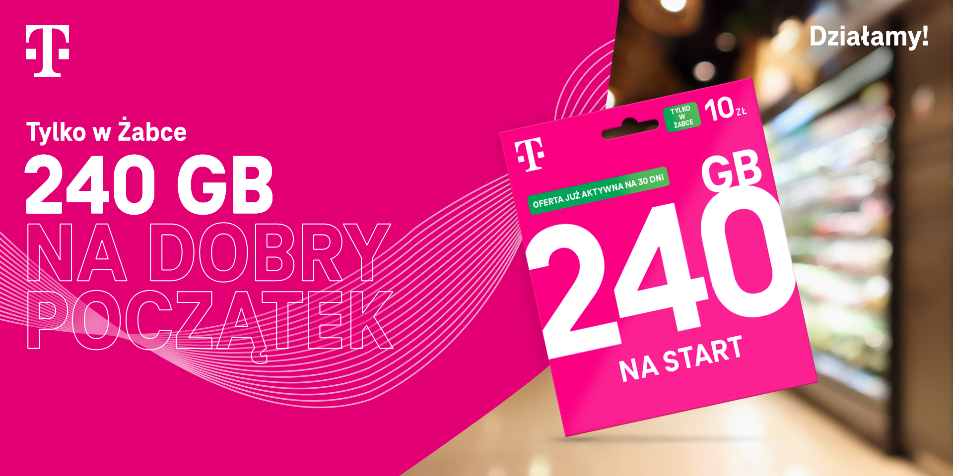 Oferta GO! M to nielimitowane rozmowy, SMS-y i MMS-y oraz 40 GB internetu (20 GB + 20 GB po doładowaniu konta za 35 zł) na 30 dni. W pierwszym miesiącu jest ona dostępna w cenie startera, i to z ogromnym pakietem łącznie 240 GB na dobry początek! Dodatkowo użytkownik zyskuje dostęp do technologii 5G. Oferta GO! M odnawia się automatycznie po 30 dniach za 35 zł. Co ważne, użytkownik może od razu aktywować w aplikacji „Mój T-Mobile” dodatkową, niemałą porcję internetu w miesięcznych pakietach po 200 GB w ramach oferty „Rok Internetu”. Łącznie można zgarnąć nawet 2400 GB ekstra przez rok (12 pakietów x 200 GB)! Nowy starter T-Mobile na kartę z 240 GB na start za 10 zł za pierwsze 30 dni łączy się z promocją, w ramach której za zakup startera T-Mobile na kartę w sieci sklepów Żabka, klient otrzyma bon wydrukowany na paragonie, który uprawnia do odbioru dowolnego hot-doga z oferty sieci Żabka. Promocyjnego zakupu należy dokonać do 10 października. Na zgarnięcie gratisowego hot-doga jest więcej czasu – można po niego wpaść do 17 października. Dodatkowe informacje o akcji organizowanej we współpracy z siecią Żabka zamieszczone są na stronie: