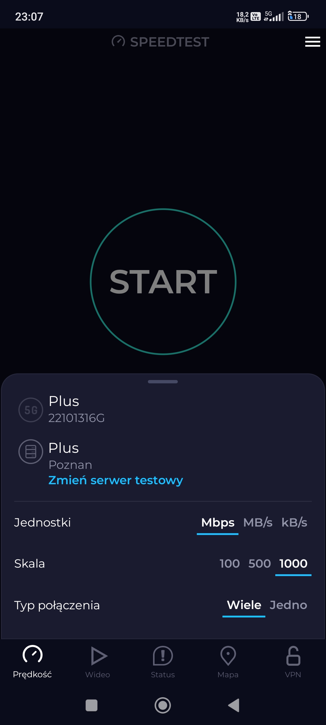 Test zrealizowaliśmy w segmencie 5G na pierwszym sektorze stacji BT-33522: Pl. Kościelny 1, śródmieście. Terminal testowy: Xiaomi Redmi Note 12 5G.