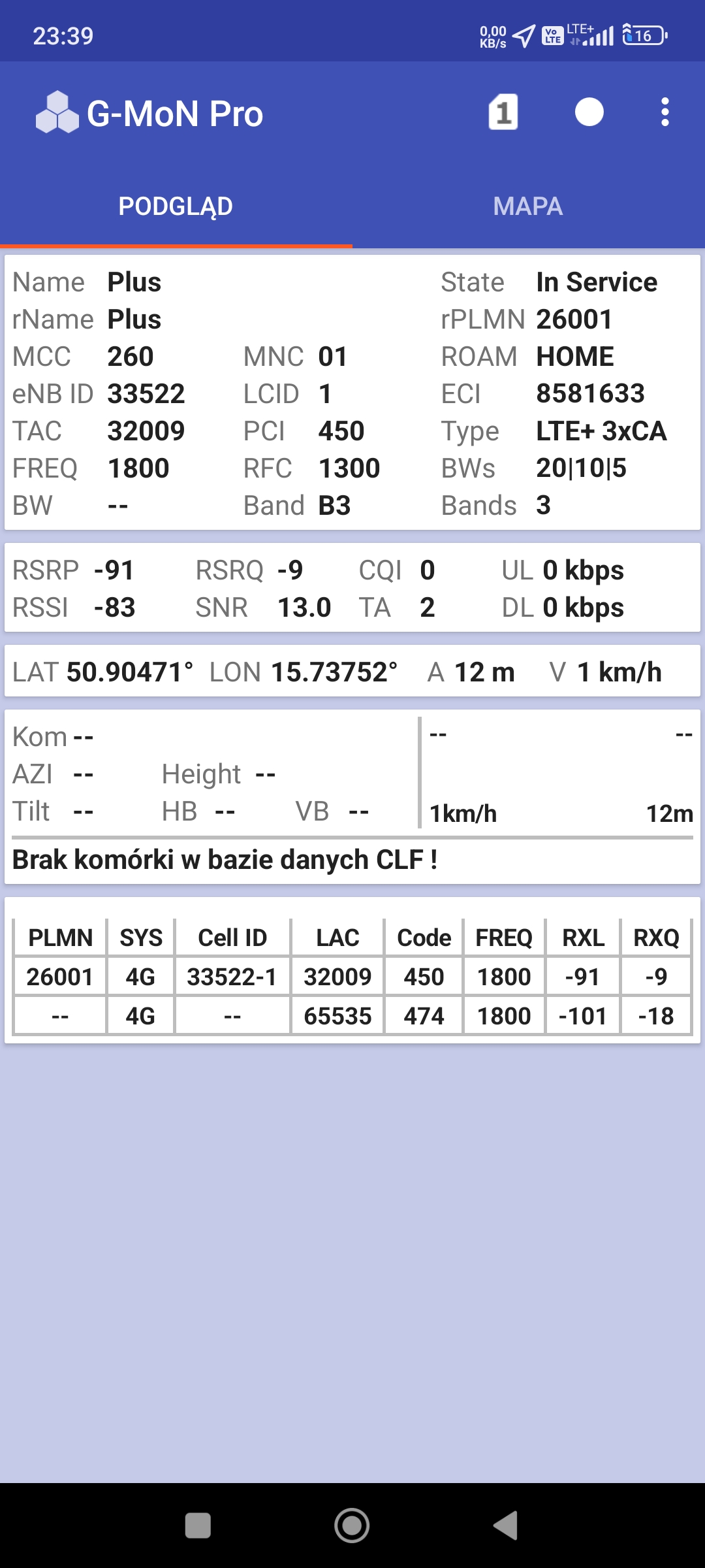 Dane z pomiarów w LTE dla tego samego sektora wyglądają jak niżej.
