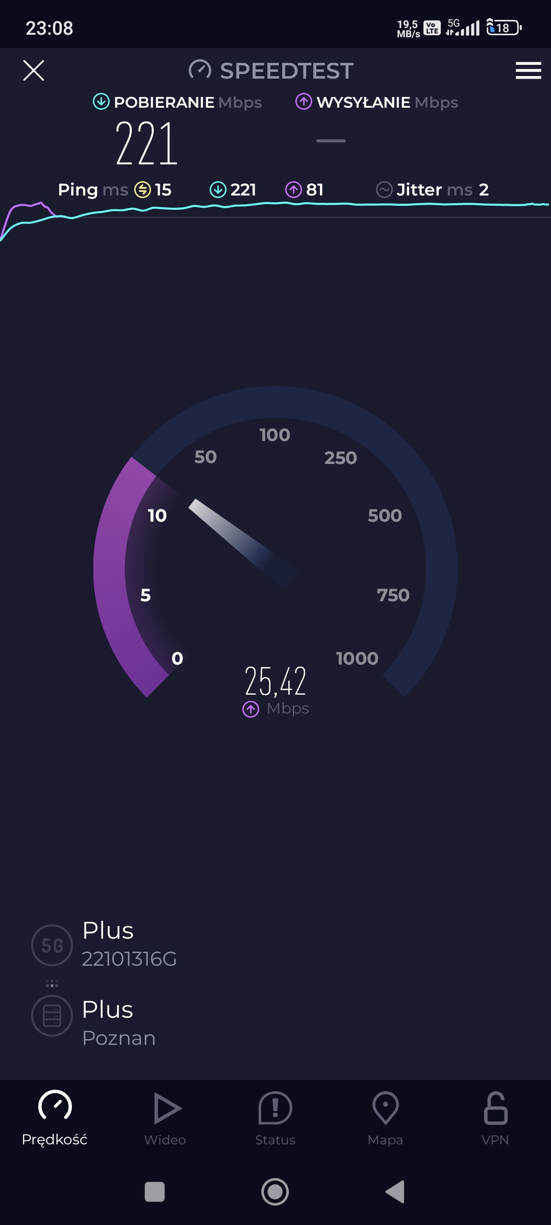 Test zrealizowaliśmy w segmencie 5G na pierwszym sektorze stacji BT-33522: Pl. Kościelny 1, śródmieście. Terminal testowy: Xiaomi Redmi Note 12 5G.