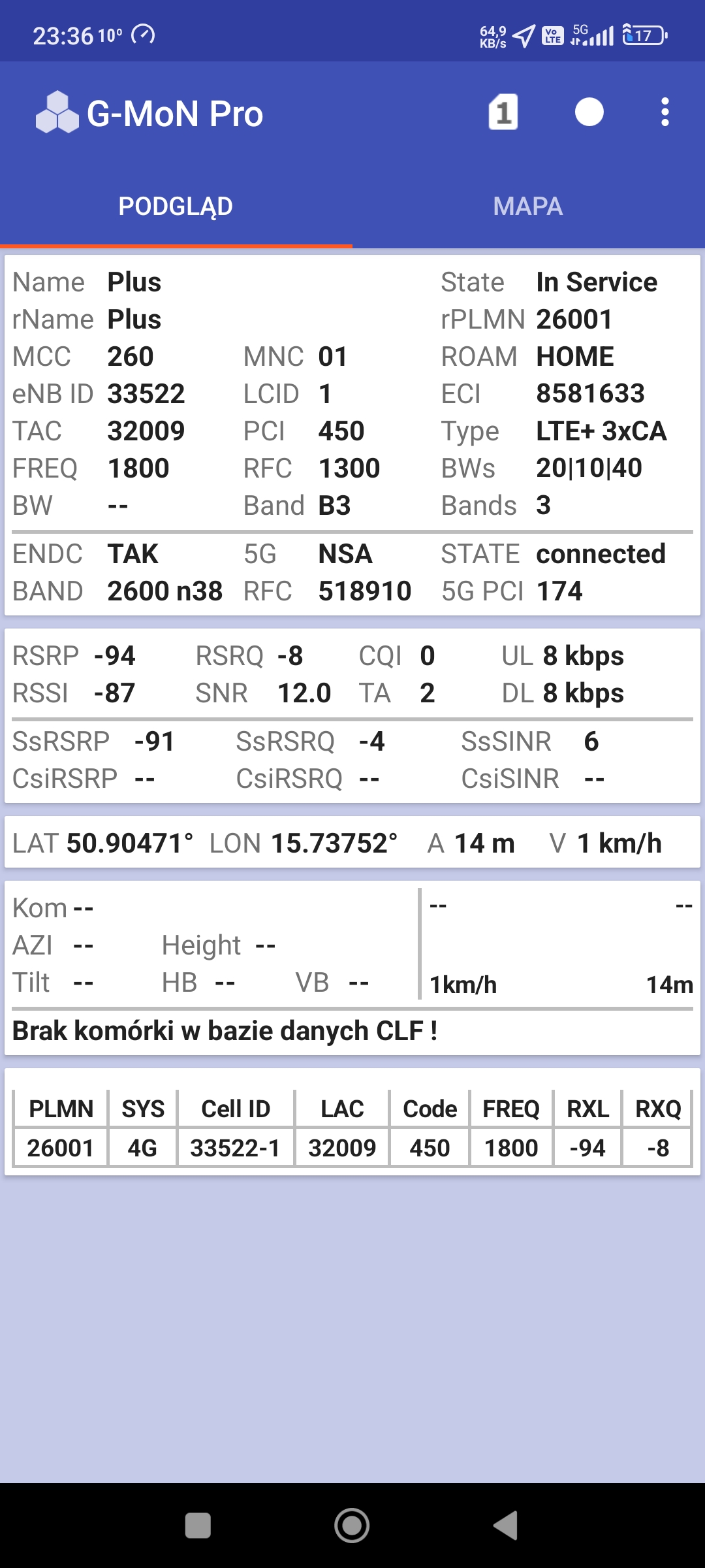 Dane z pomiarów w LTE dla tego samego sektora wyglądają jak niżej.