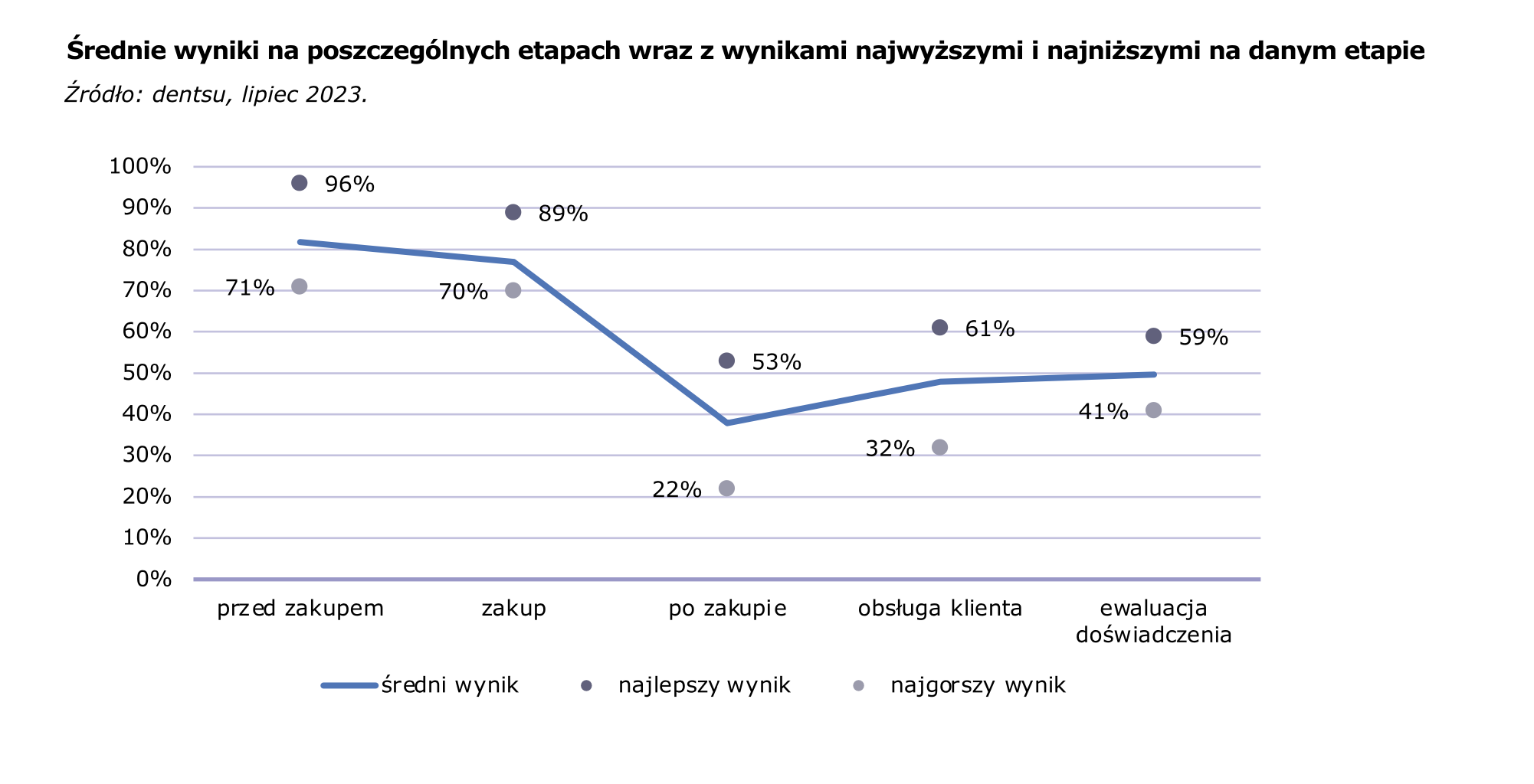 Aż 90 proc. Polaków mających dostęp do internetu korzysta z niego w celach wyszukania informacji o produktach czy sklepach, zrobienia zakupów i dzielenia się opinią o swoim doświadczeniu zakupowym [1]. Najczęściej online kupujemy sprzęt RTV/ AGD [2] i według prognoz PwC na lata 2023-2027 [3], to właśnie elektronika będzie główną siłą napędową wzrostu rynku e-commerce w Polsce. Wydawałoby się zatem, że e-sklepy ze sprzętem elektronicznym powinny być jednymi z najlepiej funkcjonujących w rodzimym handlu internetowym. Tymczasem z raportu dentsu Polska, wynika, że o ile na ogół dobrze radzą sobie z procesami komunikacyjnymi na ścieżce klienta do momentu dokonania zakupu, to w kwestii wdrażania najlepszych praktyk na etapie obsługi pozakupowej mają jeszcze dużo do nadrobienia. Średnia ocena analizowanych e-sklepów przed zakupem wyniosła bowiem aż 82 proc., na etapie zakupu scoring obniżył się do poziomu 77 proc., podczas gdy w fazie po zakupie dramatycznie spada i wynosi zaledwie 38 proc. – Nie jest sztuką namówić klienta na jednorazowy zakup. Sztuką jest przywiązać go do siebie na bazie pozytywnych doświadczeń zakupowych. Konsumenci patrzą bowiem na doświadczenie z marką całościowo, a więc brak klientocentrycznego podejścia na końcu ścieżki zakupowej może zaważyć na ich ogólnej opinii o sklepie oraz na decyzji o powrocie do niego. Odpowiedzią na to wyzwanie jest wdrożenie przez sklepy spójnej i nastawionej na potrzeby klienta komunikacji we wszystkich punktach styku z marką na każdym etapie ścieżki zakupowej – podkreśla Maciej Podgórski, Integrated Strategy Lead w dentsu Creative.