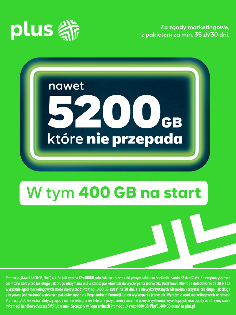 Dzięki promocji nawet 5200 GB nowi i obecni klienci mogą liczyć na dodatkowe, atrakcyjne paczki gigabajtów.  Każdy użytkownik oferty na kartę, który będzie utrzymywał aktywny pakiet za 35 złotych lub 40 zł, otrzyma dodatkowe 400 GB co miesiąc przez rok, czyli w sumie 4800 GB. Nowi użytkownicy Plus na Kartę mają szansę otrzymać także 400 GB na początek. Wystarczy zakupić starter i w ciągu 30 dni od momentu aktywacji doładować konto kwotą minimum 20 zł i wysłać SMS o treści ZGODA na numer 80087. Doładowanie nie przepada, a środki mogą być wykorzystane na dowolne pakiety, połączenia lub SMS-y. Wysłanie SMS-a jest jednoznaczne z wyrażeniem zgody na otrzymywanie informacji marketingowych. Razem to aż 5200 GB.