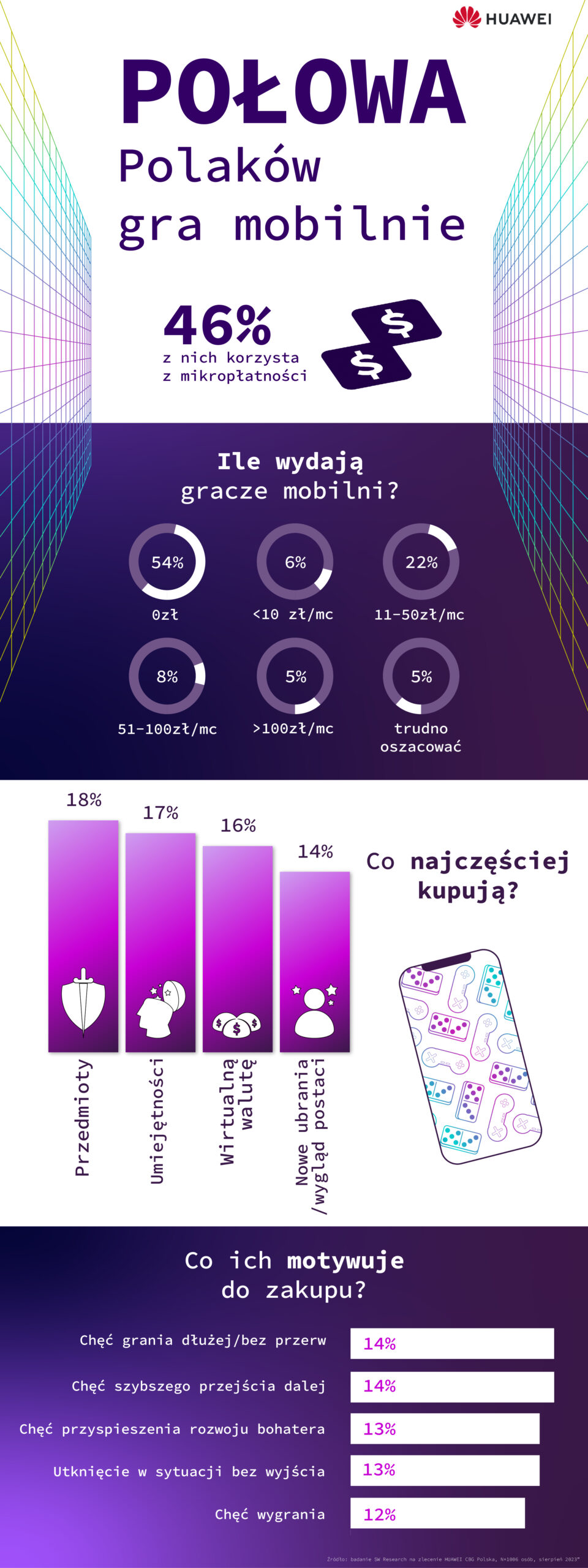Warszawa, 7 lutego 2024 r. – Już prawie połowa Polaków gra na smartfonie lub tablecie (49%). Stawiamy na tę formę rozrywki, ponieważ można na nich grać wszędzie, mając przy tym duży wybór bezpłatnych tytułów bez wygórowanych wymagań sprzętowych. Ta przystępność sprawia, że aż 60% graczy mobilnych ściągnęło nową grę w ciągu ostatniego miesiąca, 36% w ostatnim tygodniu, a 46% chce szybciej osiągnąć cele i testować kolejne gry, więc korzysta z mikropłatności. Dzięki wirtualnym zakupom chcą przede wszystkim skracać czas rozwinięcia swojej postaci, zwiększać szanse na wygraną czy cieszyć się rozgrywką bez zbędnych przerw. Zazwyczaj przeznaczają na to do 50 złotych miesięcznie – wynika z badania Huawei CBG Polska [1].