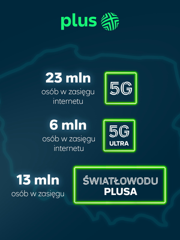 Dzięki blisko 3700 stacjom bazowym z internetu 5G mogą korzystać już 23 miliony osób w 1150 mniejszych i większych miejscowościach we wszystkich województwach. Plus powiększa także zasięg sieci 5G Ultra. Rozwiązanie to wykorzystuje agregację, czyli łączenie 3 pasm radiowych – dwóch w technologii 5G (2600 MHz i 2100 MHz) oraz dodatkowo warstwy 4G (1800 MHz) – do szybkiej transmisji danych. Technologia 5G Ultra jest obecnie dostępna w 257 mniejszych i większych miejscowościach na terenie całego kraju. Aktualnie 5G Ultra obsługuje blisko 1000 stacji. Dzięki temu w zasięgu internetu mobilnego szybkiego jak światłowód jest już 6 milionów osób. Z zalet sieci 5G oraz 5G Ultra mogą bez dodatkowych opłat korzystać wszyscy klienci posiadający ofertę abonamentową, na kartę i internetową od Plusa oraz Plusha. Wystarczy posiadać smartfon lub router obsługujący tę technologię oraz przebywać w zasięgu sieci. Dzięki temu klienci zyskują szybki transfer danych oraz płynne korzystanie z usług online, takich jak strumieniowanie wideo w jakości 4K lub 8K, gry w chmurze bez opóźnień, oglądanie relacji na żywo bez zacinania, szybkie pobieranie plików, przesyłanie dużych załączników w krótkim czasie oraz efektywne działanie wielu urządzeń jednocześnie podłączonych do sieci.