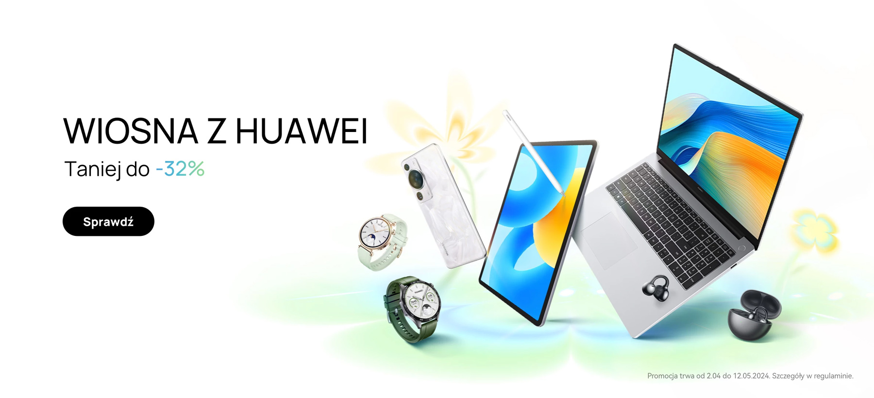 Warszawa, 3 kwietnia 2024 r. – Przyszła wiosna, a wraz z nią atrakcyjne promocje na huawei.pl. Na klientów czekają doskonałe oferty, w ramach których mogą okazyjnie kupić: wydajne laptopy, eleganckie smartwatche, tablet dla artystów, fotograficzny smartfon oraz słuchawki marki. Dodatkowo do wybranych laptopów sklep dorzuca trzeci rok gwarancji w prezencie lub pakiet Microsoft 365 Family na 12 miesięcy! Promocja trwa w dniach od 2 kwietnia do 12 maja 2024 r. lub do wyczerpania zapasów.