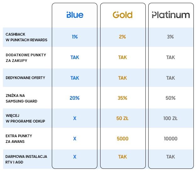 W nowej odsłonie programu Samsung Rewards, zależnie od wartości zakupów realizowanych na samsung.pl, uczestnicy mogą uzyskać jeden z trzech poziomów członkostwa: Blue (tuż po rejestracji), Gold lub Platinum. Im wyższy poziom, tym wyższa wartość dodatkowych benefitów przysługujących kupującym. Zarejestrowani w programie mogą liczyć na zniżki przy zakupie dodatkowej pogwarancyjnej ochrony serwisowej, bonusowe zniżki do wykorzystania w Programie OdZysk, czy bezpłatną usługę instalację sprzętu RTV i AGD w przypadku poziomu Gold i Platinum. Jednocześnie zmianie uległ też poziom zwrotu – odzyskać można od 1 do 3% zwrotu wartości zamówienia, w punktach Samsung Rewards, do wymiany na zniżki na kolejne zakupy (dotychczas był to 1%).