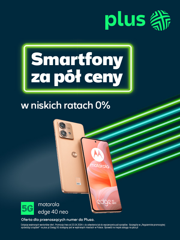 – motorola edge 40 neo 5G 12/256G dostępny będzie za 1 złoty na start i 12 rat po 78,99 zł/mies., łącznie 949 złotych (najniższa cena z 30 dni przed obniżką: 1699 złotych)