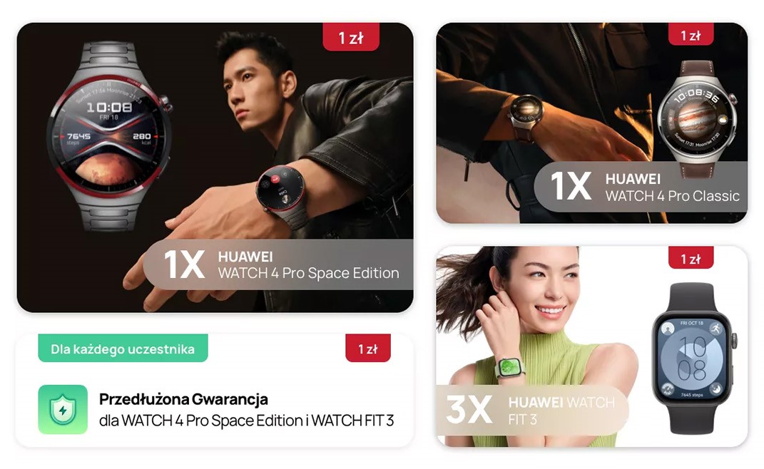 Ponadto wszyscy uczestnicy konkursu otrzymają kupon, dzięki któremu przy zakupie smartwatchy HUAWEI WATCH FIT 3 lub HUAWEI WATCH 4 Pro Space Edition będą mogli za 1 zł przedłużyć o rok gwarancję.