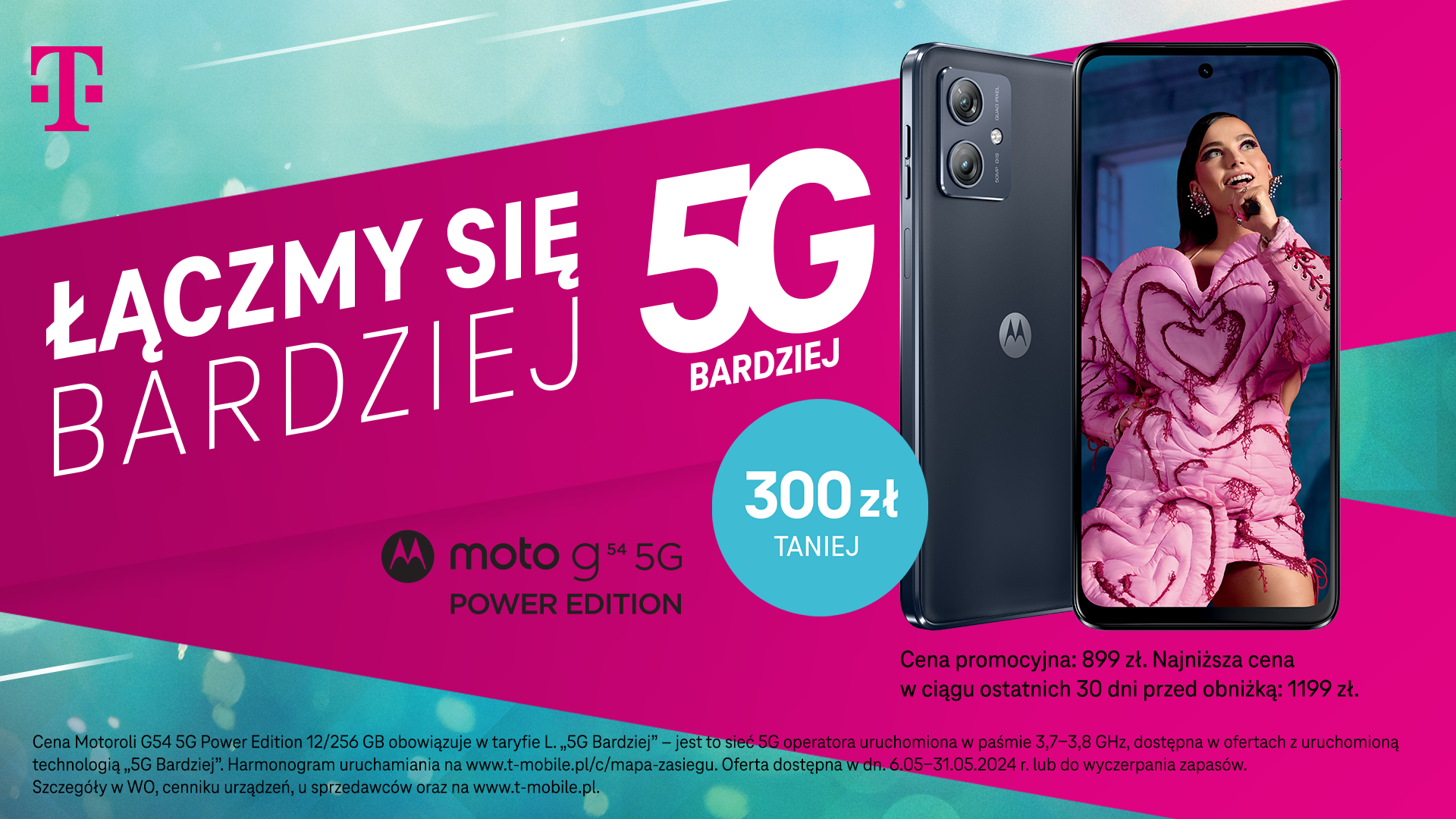 Drugim dostępnym w ofercie smartfonem jest Motorola Moto G54 5G Power Edition, która ma na pokładzie bardzo mocną baterię 6000 mAh. Urządzenie z 6,5-calowym ekranem z rozdzielczością Full HD+ z wysoką częstotliwością odświeżania 120 Hz pozwoli użytkownikom na płynne przeglądanie treści. 256 GB miejsca na dane z opcją rozszerzenia o kartę microSD 1 TB umożliwi im zaś swobodne przechowywanie najpiękniejszych zdjęć i filmów. Klienci T-Mobile wybierając taryfę „L Nielimitowana” mogą teraz kupić ten smartfon o 300 zł taniej, po obniżce z 1199 zł do 899 zł. W taryfie „M Nielimitowana” zniżka wynosi zaś 200 zł.