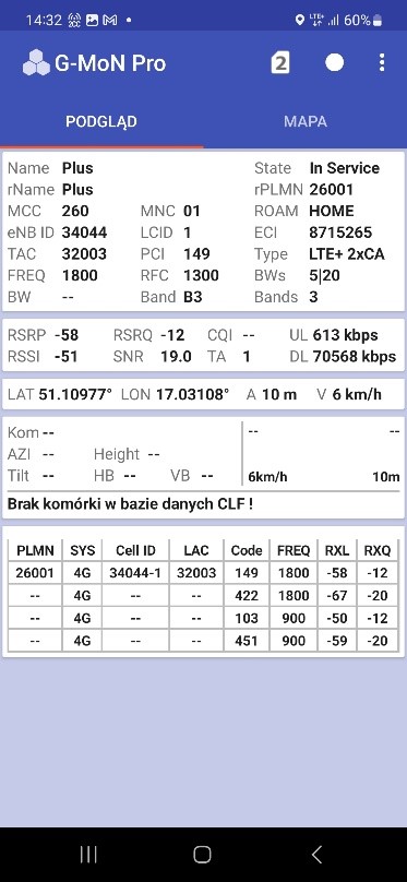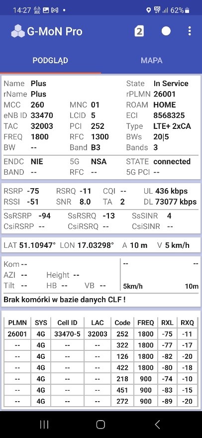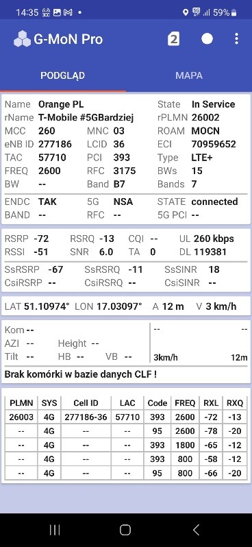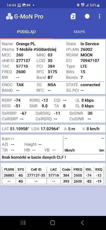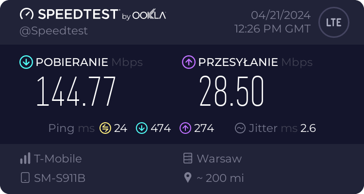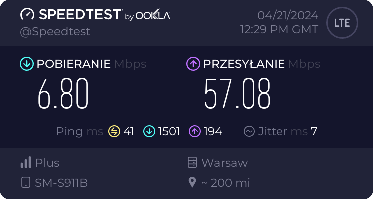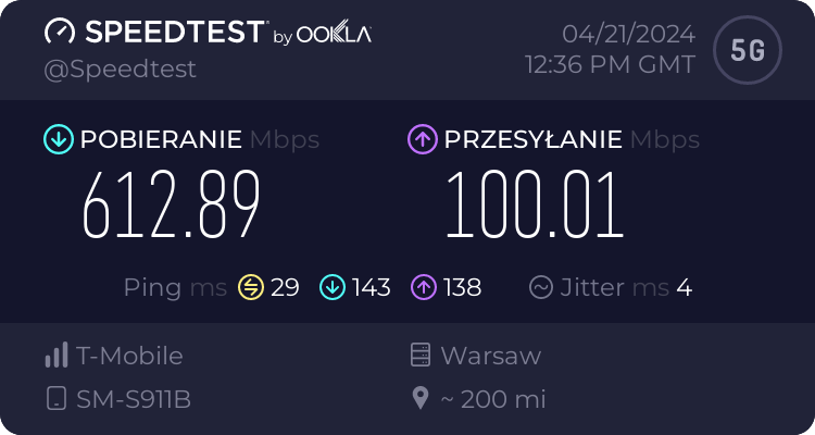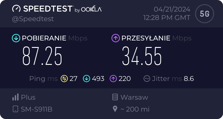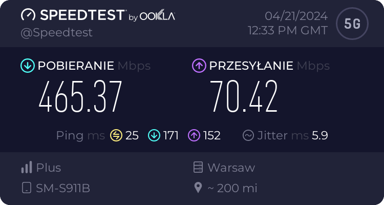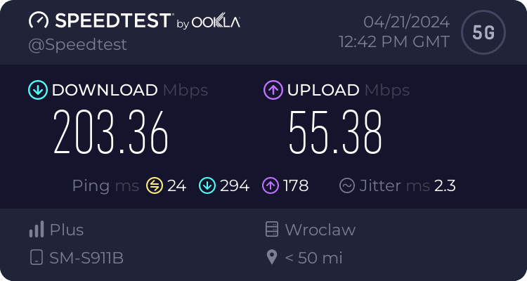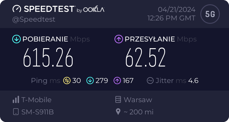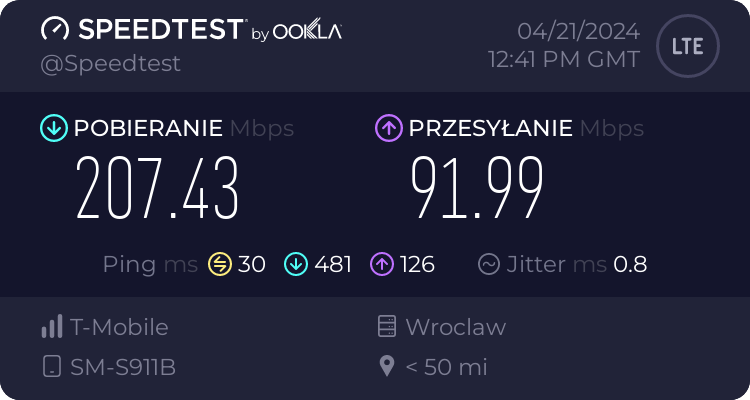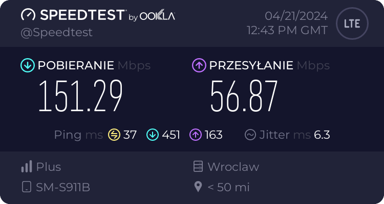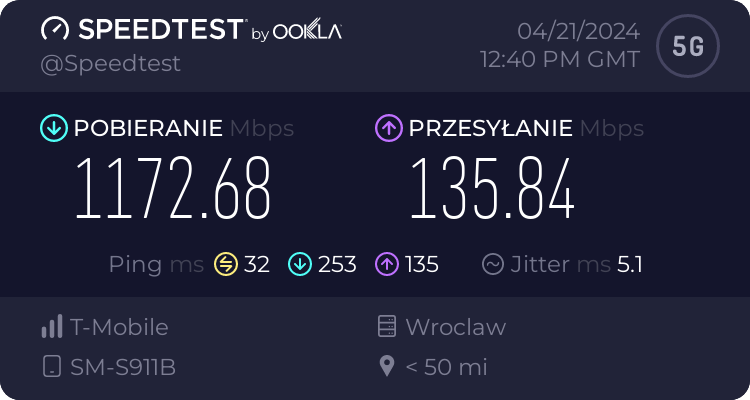 Od naszego Czytelnika otrzymaliśmy testy transmisji danych dla sieci Plus oraz T-Mobile dla wrocławskiego rynku – trzy punkty pomiarowe. Testy speedtest były realizowane przy wykorzystaniu najszybszych serwerów dla miasta Wrocławia, tj. „Skynet DC – Warsaw” oraz „FineMedia Wrocław”. Realizacja: na zewnątrz (w miejscu). Terminal wykorzystywany do testów niestety nie prezentował dla sieci Plus częstotliwości zestawionych do agregacji pasm w przypadku 5G Ultra. W przypadku drugiego punktu pomiarowego nie otrzymaliśmy wyników LTE ani dla Plusa ani dla T-Mobile.