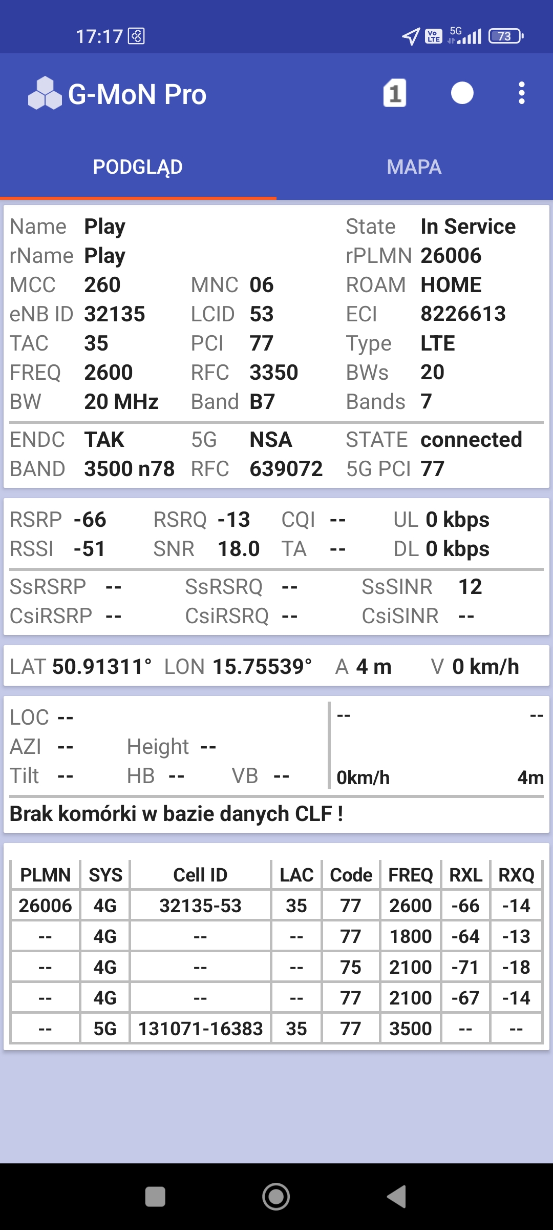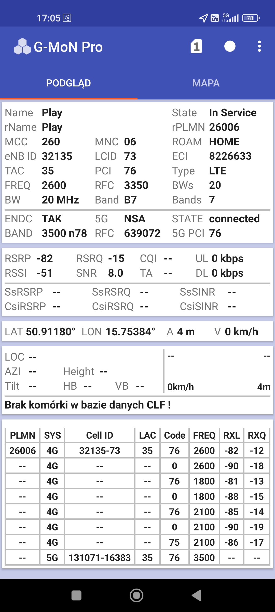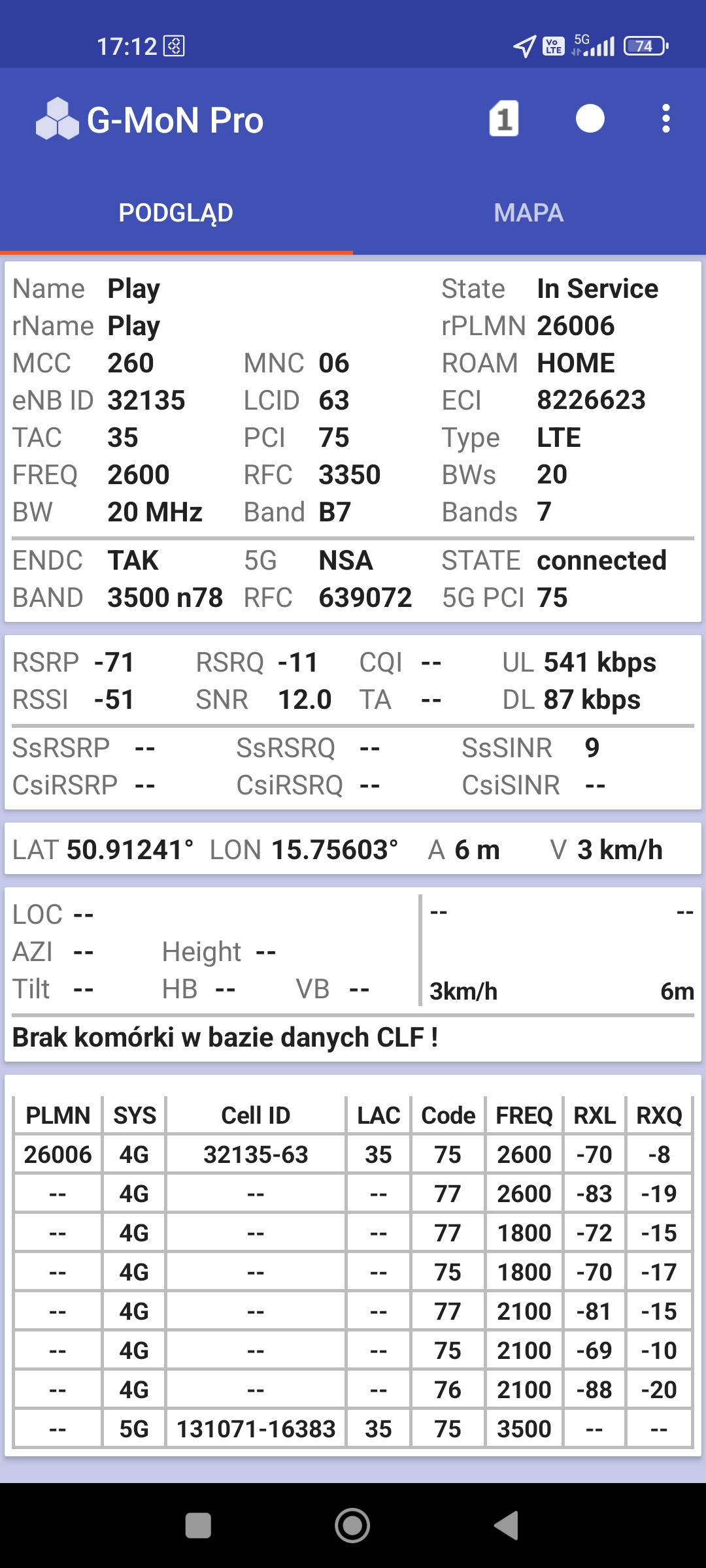 Zrzuty ekranów z pomiarów 5G w stacji przy ul. Komedy-Trzcińskiego 10 (JEL3009). Stacja pracuje na dachu bloku 10-piętrowego.