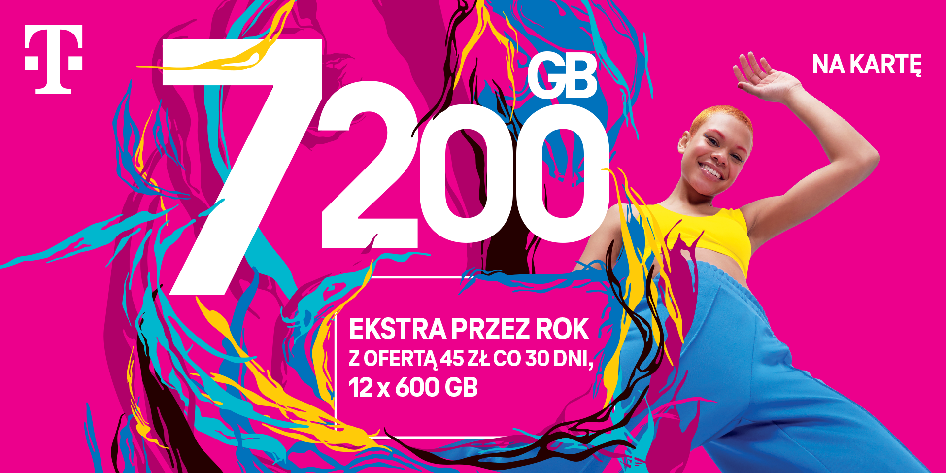 W T-Mobile cenimy najlepsze doświadczenia. A tych z pewnością nie zabraknie dzięki najnowszej ofercie T-Mobile na kartę, w której na klientów oferty GO! L czeka pokaźna paczka aż 7200 gigabajtów ekstra przez rok (12 x 600 GB z ofertą za 45 zł co 30 dni) z możliwością skorzystania z superszybkiej sieci 5G. W sezonie wakacyjnym w T-Mobile nie zwalniamy tempa i przygotowujemy dla naszych klientów wiele atrakcyjnych ofert! Tym razem ruszamy z ofertą dla użytkowników usług T-Mobile na kartę, w ramach której porcji gigabajtów wystarczy nawet na najśmielsze plany! Jak odebrać aż 7200 GB? To bardzo proste! Wystarczy, że klient zakupi starter za 5 zł, doładuje konto, następnie włączy oferty GO! L za 45 zł oraz „Rok Internetu” w aplikacji „Mój T-Mobile”. Tym prostym ruchem zyskuje wszystko, co niezbędne, aby być w łączności z bliskimi i ze światem, czyli: nielimitowane rozmowy, SMS-y, MMS-y oraz 60 GB z oferty GO! L (30 GB w ramach oferty i 30 GB po doładowaniu), a do tego jeszcze pierwszą paczkę aż 600 GB z oferty „Rok Internetu”. Po upływie 30 dni oferta GO! L odnowi się automatycznie i pobrana zostanie opłata w wysokości 45 zł. Na konto Użytkownika trafi zaś kolejna porcja 600 GB. Łącznie użytkownik zyska aż 7200 GB, czyli 12 Pakietów po 600 GB, z których może korzystać przez 365 dni!