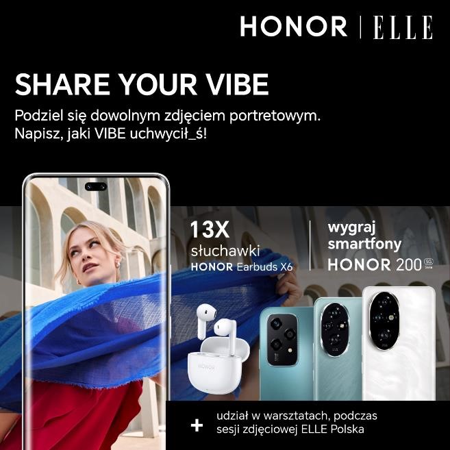 Konkurs nosi nazwę „Podziel się swoją Sztuką Portretowania”i jest dostępny na instagramowym oraz facebookowym profilu marki HONOR. Główną nagrodą są nowe smartfony z serii HONOR 200 – za 1 miejsce HONOR 200 Pro, za 2 miejsce HONOR 200, a za ostatnie miejsce na podium HONOR 200 Lite. Spośród wszystkich zgłoszeń, wyłonione zostaną również osoby, które będą mogły wziąć udział w sesji zdjęciowej magazynu ELLE Polska i zobaczyć, jak wygląda jej organizacja. Dodatkowo codziennie każde zgłoszenie ma szansę wygrać słuchawki HONOR Earbuds X6.