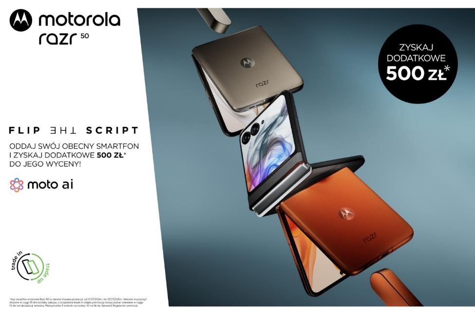Motorola razr 50 (8/256 GB) debiutuje w Polsce, w rekomendowanej cenie detalicznej 3999 zł. Smartfon można zakupić w sieciach sprzedaży: RTV EURO AGD, Media Expert, Media Markt, x-kom, Komputronik, Neonet i Moliera2, ale również na stronach sprzedaży eLenovo oraz Sferis. Motorola razr 50 trafi także do oferty operatorów: Plus, Play, Orange i T-Mobile. Kupując smartfon pomiędzy 10 a 23 lipca (włącznie), konsumenci mogą skorzystać z programu Motorola „Trade in. Trade up”. Pozwala on na oddanie innego smartfona do recyklingu – Motorola wraz z partnerem akcji wycenią oddawane w rozliczeniu urządzenie i wypłacą biorącemu udział w promocji konsumentowi gwarantowane 500 złotych, powiększone o kwotę zaproponowanej wyceny. Szczegółowe informacje nt. programu „Trade in. Trade up” oraz lista smartfonów, które konsument może oddać do recyklingu, są dostępne na stronie programu.