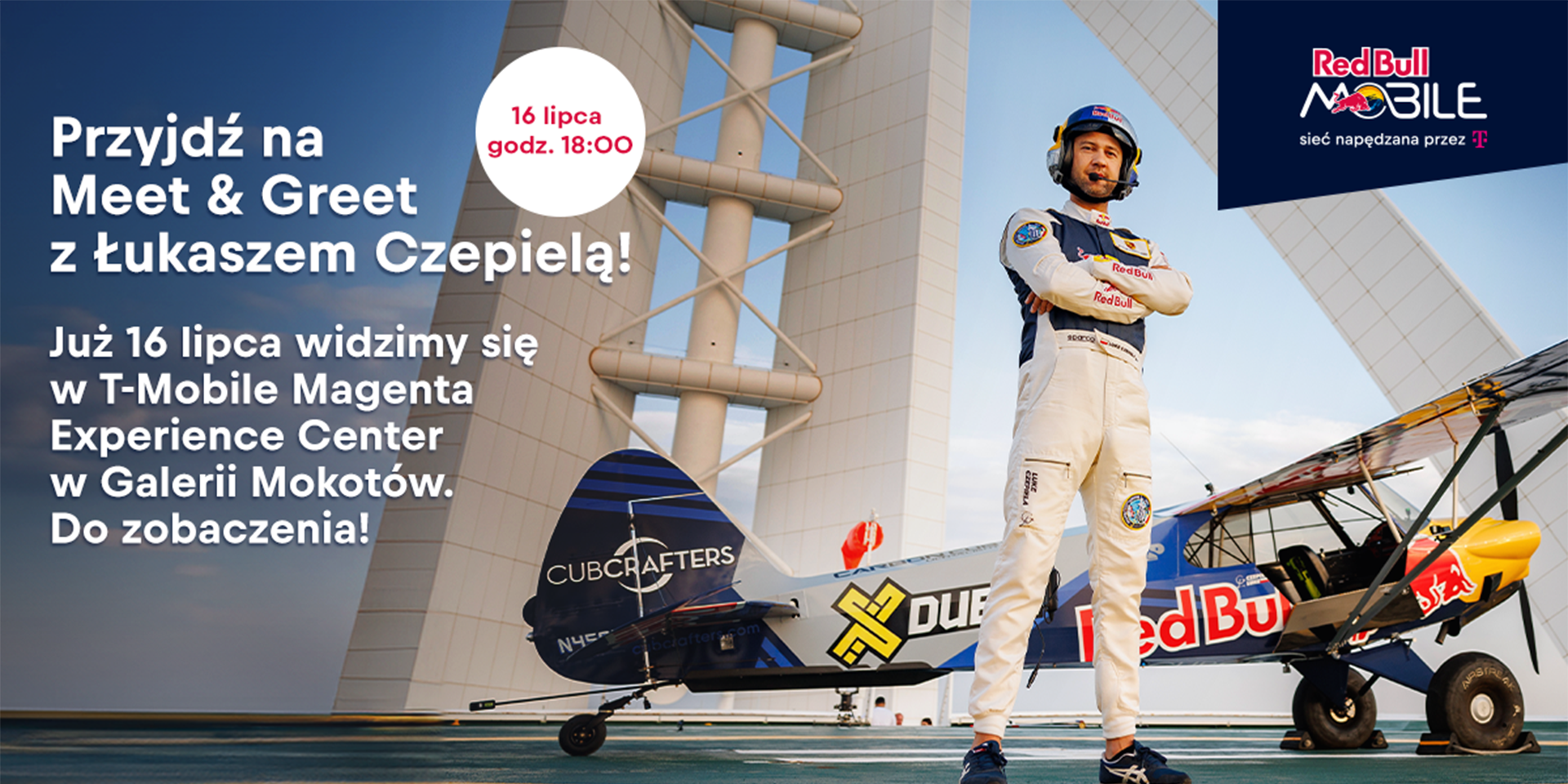 Jak to jest lądować na szczycie wieżowca w Dubaju? Lub na deskach sopockiego molo? O to wszystko zapytać będzie można Łukasza Czepielę – pilota akrobacyjnego i czterokrotnego mistrza świata Klasy Challenger, a teraz także ambasadora marki Red Bull MOBILE. Na najbardziej odlotowe spotkanie w Warszawie zapraszamy już we wtorek na godz. 18:00 do Magenta Experience Center. W T-Mobile uwielbiamy zaskakiwać i dostarczać niezapomnianych emocji, dlatego w ramach promocji naszej oferty Red Bull MOBILE organizujemy spotkanie otwarte dla wszystkich z człowiekiem nie z tej ziemi! Łukasz Czepiela to utalentowany pilot akrobacyjny i wyścigowy, który ma na swoim koncie nie tylko liczne tytuły mistrzowskie, ale też absolutnie szalone wyczyny, jak choćby lądowanie na dachu 320-metrowego wieżowca w Dubaju – Burdż al-Arab – jednym z najwyższych budynków w mieście. A teraz do listy tytułów, którymi Łukasz może się pochwalić dołącza kolejny: ambasadora Red Bull MOBILE! Z tej okazji w T-Mobile Magenta Experience Center w warszawskiej Westfield Mokotów (d. Galeria Mokotów) przy ul Wołoskiej 12, już w najbliższy wtorek (16 lipca) o 18:00 rozpocznie się spotkanie Meet&Greet z Łukaszem, podczas którego każdy będzie miał okazję porozmawiać z mistrzem, poznać tajniki przygotowań do lotów wyścigowych czy najbardziej spektakularnych lądowań.