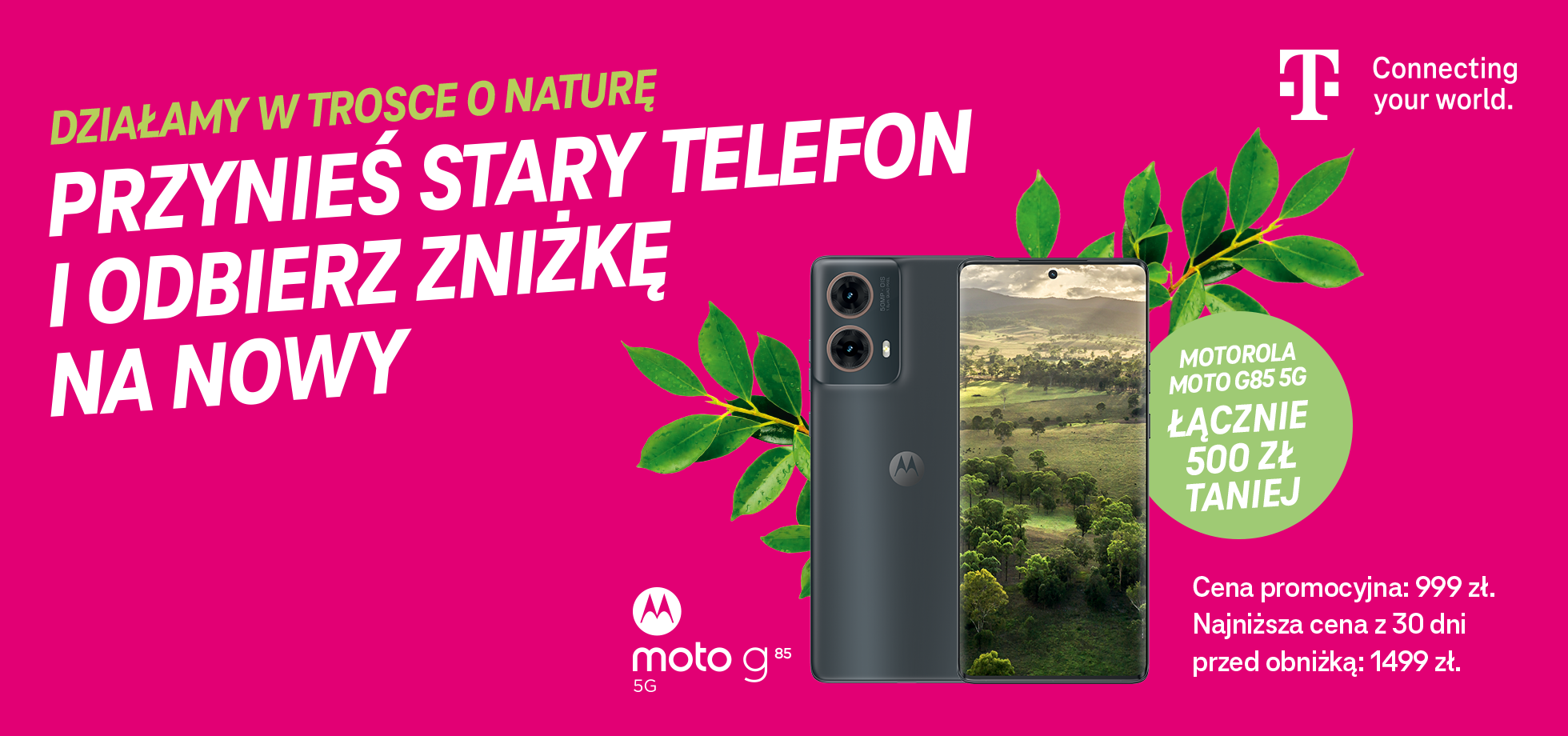 Motorola Moto G85 5G w taryfie „L Nielimitowana” objęta jest obecnie w T-Mobile rabatem w wysokości 400 zł. Dodatkowo u osób, które zdecydują się na oddanie starego urządzenia do recyklingu, naliczony zostanie kolejny, 100-złotowy upust – razem 500 zł.