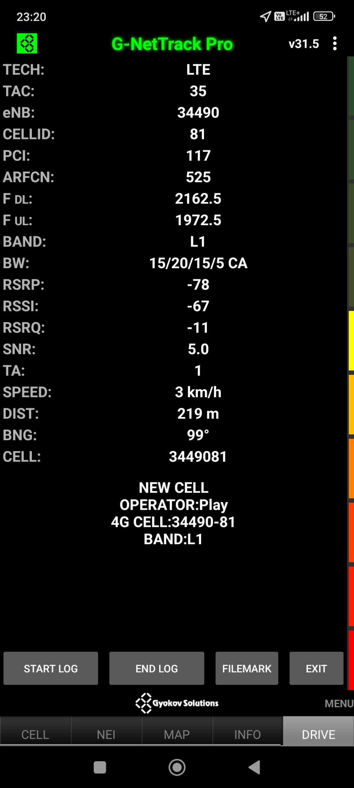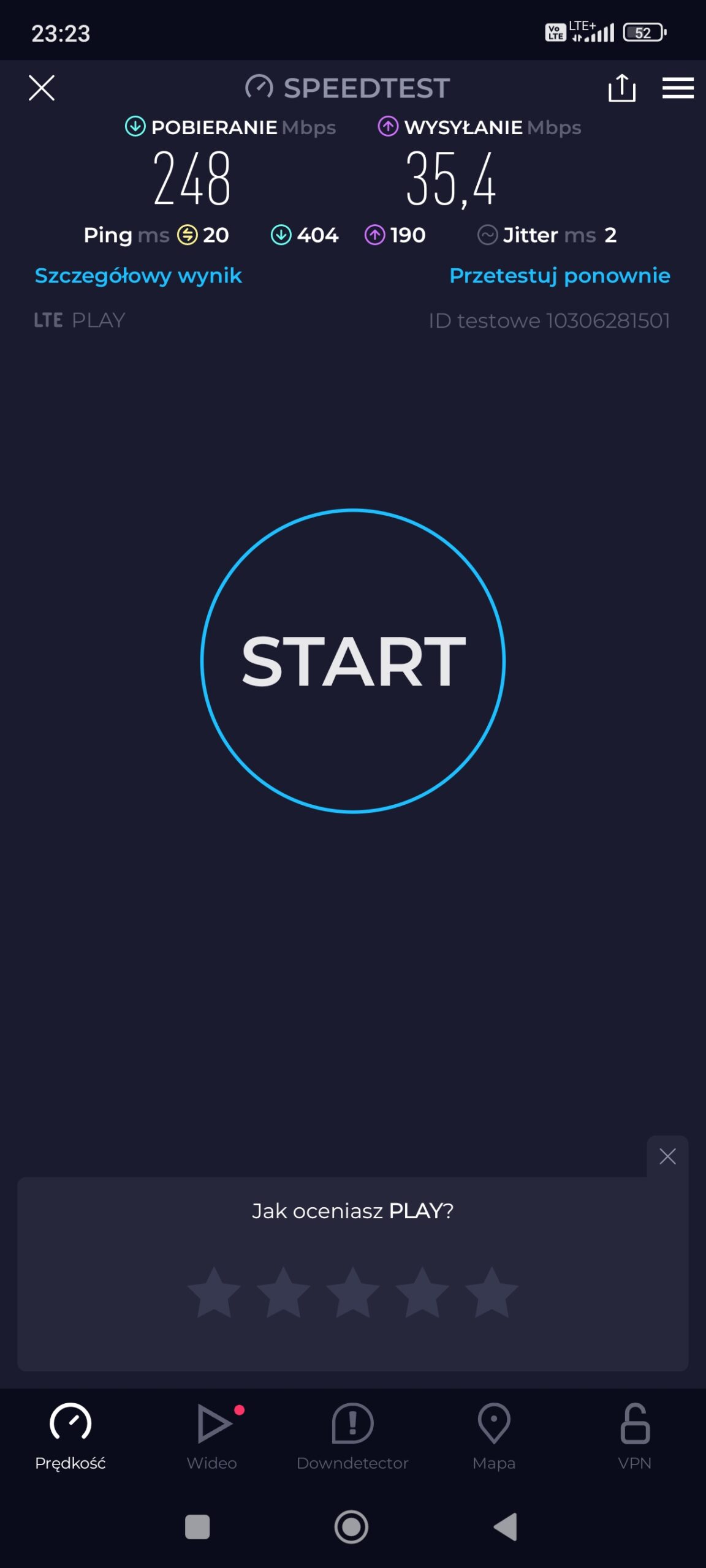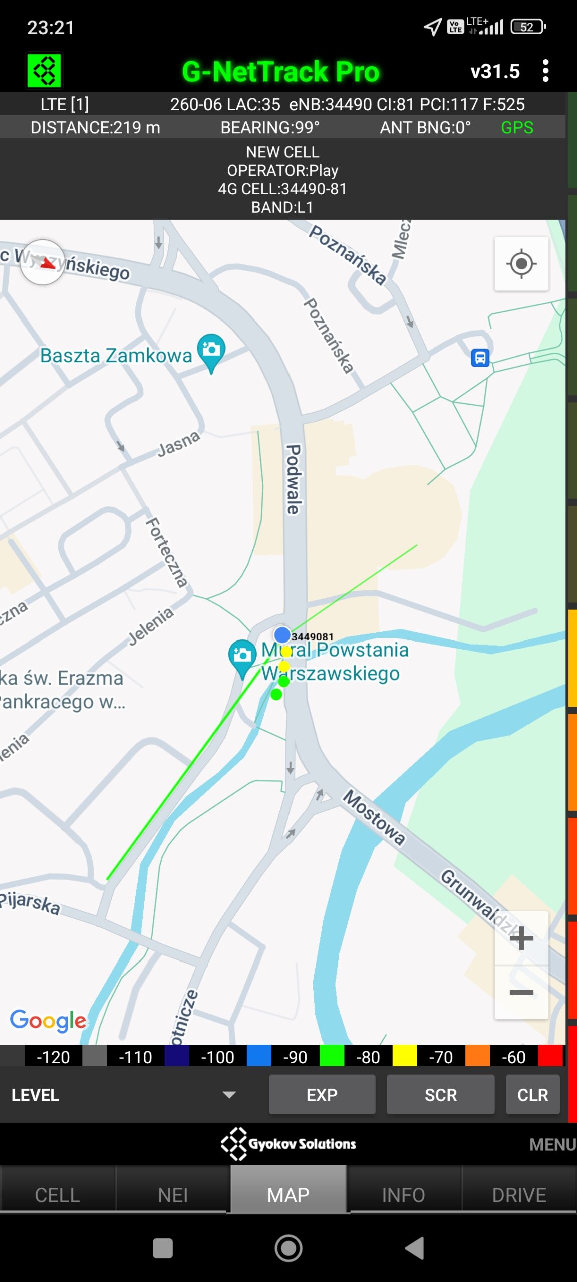 Druga stacja Play, w której realizowano pomiary w tym samym dniu, tj. przy ul. Różyckiego 5 dziś wciąż była off-line. W przypadku tej stacji podkreślamy ważność sektorów z azymutami w kierunku do Szpitala Wojewódzkiego (110 stopni, sektor powinien być elektrycznie uptiltowany) oraz w kierunku centrum ( azymut 230 stopni). Oba sektory powinny pracować efektywniej, aniżeli definiuje to tzw. automatic-default.