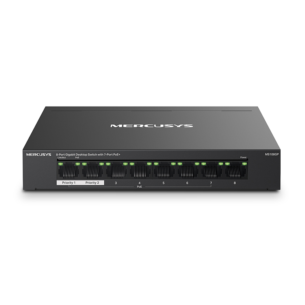 Mercusys przedstawia swoją pierwszą linię przełączników PoE typu desktop. To cztery kilkuportowe modele, które świetnie sprawdzą się w domowych instalacjach kamer CCTV. Nowe switche można również wykorzystać przy wdrożeniu systemu telefonii IP lub punktów dostępowych WiFi w małym biurze.  Przełączniki PoE od Mercusys mają kilka cech wspólnych, które czynią je wyjątkowo wygodnym i uniwersalnym rozwiązaniem. Wszystkie modele oferują funkcję zasilania PoE+, co pozwala na zasilanie urządzeń sieciowych bez konieczności stosowania dodatkowych zasilaczy. Dodatkowo, każdy przełącznik wyposażono w tryb „Extend”, który umożliwia zwiększenie zasięgu transmisji PoE do 250 metrów, oraz tryb izolacji, zapewniający dodatkowe bezpieczeństwo sieci. Wszystkie urządzenia posiadają metalową obudowę oraz działają bezwentylatorowo, co zapewnia cichą i stabilną pracę. Technologia „plug and play” sprawia, że instalacja tych urządzeń jest szybka i bezproblemowa. Na uwagę zasługuje przede wszystkim 8-portowy przełącznik MS108GP. Posiada on 8 gigabitowych portów, w tym 7 portów PoE+ zgodnych ze standardami 802.3af/at. Każdy z portów PoE oferuje do 30 W, zaś łączny budżet mocy w tym modelu to 65W.
