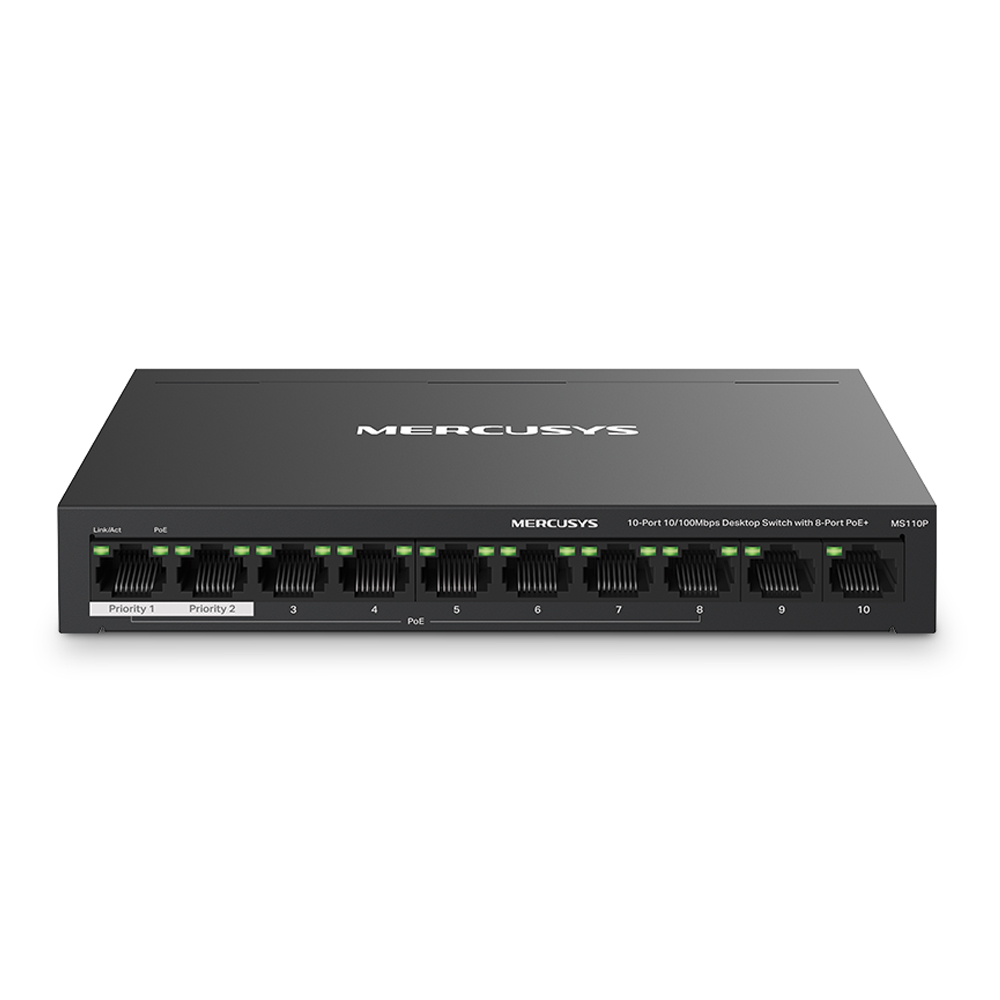 Portfolio przełączników PoE uzupełniają dwa modele z portami Fast Ethernet – MS110P i MS106LP. MS110P posiada 10 portów RJ45 10/100 Mb/s, z czego 8 to porty PoE+ zgodne ze standardem 802.3af/at oferujące do 30 W mocy na każdym z nich. Łączny budżet mocy przełącznika to 65 W. Urządzenie posiada dwa porty uplink, które pozwalają na połączenie zarówno z resztą sieci, jak i urządzeniem typu NVR, co czyni go idealnym rozwiązaniem dla instalacji monitoringu.