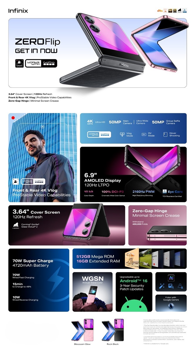 Infinix ujawnił swojego najnowszego flagowca – składany model ZERO Flip, który jako pierwszy smartfon w swojej klasie oferuje funkcje wideo 4K ProStable zarówno w przedniej, jak i tylnej kamerze, a także płynną łączność GoPro i bardzo wytrzymałą baterię. Dla użytkowników składanych telefonów kluczową kwestią jest ich wytrzymałość. Zastosowany w Inifnix ZERO Flip zawias zapewnia trwałość do nawet 400 tys. otwarć i zamknięć.