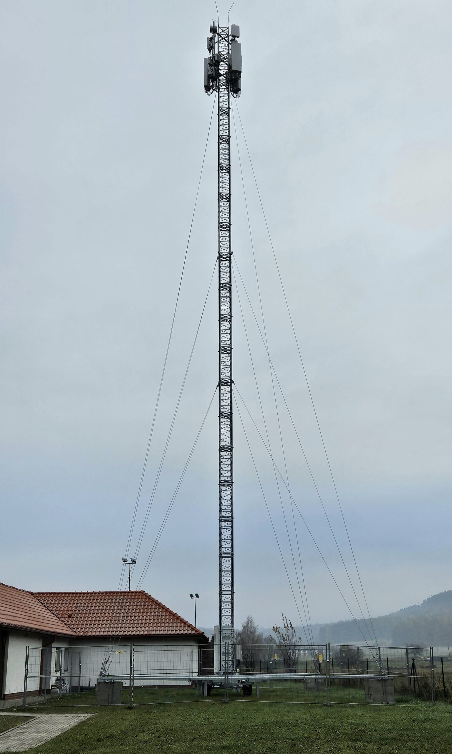 Charakteryzuje się bardzo wysoką estetyką wykonania – również w kwestii adaptacji z krajobrazem (nawet wtapia się trochę w otoczenie i nie rzuca bardzo w oczy). Została postawiona na masztowej konstrukcji odciągowej, zlokalizowanej na terenie sąsiadującym z budynkiem technicznym stadionu miejskiego w Radkowie. Konstrukcja ma bardzo wysoką nośność. Dzięki temu urządzenia są na niej zainstalowane w sposób identyczny jak na stacjach stacjonarnych – łącznie z RRU u góry. Ponadto warto zauważyć, że tak „luksusowe” wyposażenie w technologie i pasma tego „tempa” nie jest podyktowane szczególnym zapotrzebowaniem na pojemność sieci w tym miejscu. Jak udało mi się dowiedzieć stacja jest jedną z kilku w Polsce takich lokalizacji NetWorkS, mających na celu testowanie pasma N78 w warunkach wiejskich, nisko zurbanizowanych i górskich. Została pod tym kątem odpowiednio skonfigurowana. Wzięto też pod uwagę ograniczenia przepustowości radia dosyłowego Huawei. Przepustowość w zakresie pasma N78 została ograniczona software’owo do ~850 Mbps per user na każdym z sektorów. W zakresie LTE ograniczenie ustawiono jedynie na azymucie 175° (południowy – wschód) do 250 Mbps. Na sektorze 55° było możliwe osiągnięcie wartości ponad 500 Mbps. Stacja doskonale doświetla również górską drogę „Stu Zakrętów” z Radkowa do Karłowa. Tam gdzie dotąd o LTE można było pomarzyć teraz można uzyskiwać miejscami ponad 100/150 Mbps. Inwestycja była bardzo potrzebna ponieważ w tamtą okolice Radkowa sygnał ze stacji na wieży kościoła dociera w zmiennych, znikomych wartościach. Tym samym operatorzy globalni w Radkowie i okolicy są pierwszymi, oferującymi 5G i to w dodatku w paśmie C!