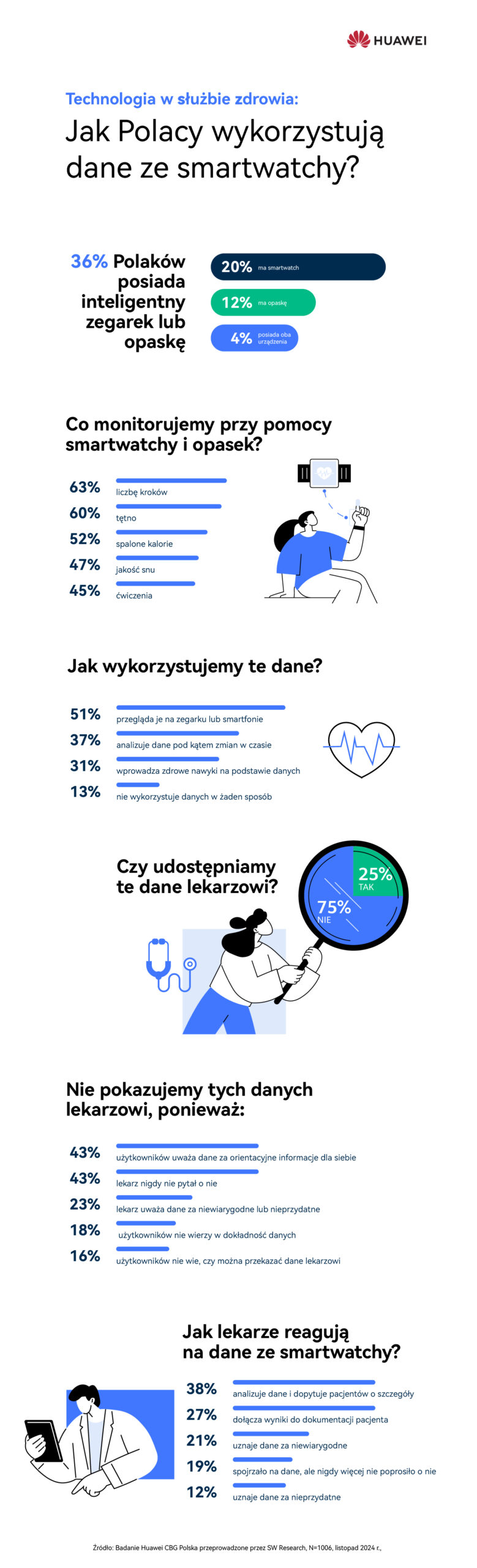 Warszawa, 18 grudnia 2024 r. – Z urządzeń ubieralnych, czyli inteligentnych zegarków i opasek, korzysta ponad 1/3 Polaków – wynika z badania Huawei CBG Polska [i]. Sprzęty te pozwalają na monitorowanie aktywności fizycznej, a także kluczowych parametrów zdrowotnych, takich jak tętno i saturacja krwi, a nawet EKG czy ciśnienie tętnicze. Dane te mogą dostarczać cennych informacji zarówno posiadaczowi zegarka, jak i lekarzowi, wspierając diagnostykę. W praktyce zaledwie 25% użytkowników pokazała doktorowi zebrane w ten sposób wyniki. Dlaczego tak się dzieje? I czy warto promować wykorzystywanie danych odpacjenckich w polskiej służbie zdrowia? Inteligentne zegarki i opaski sportowe stają się codziennymi towarzyszami Polaków. Już teraz ponad 1/3 z nas (36%) posiada te urządzenia, w tym co piąta osoba (20%) ma smartwatch, 12% opaskę, a 4% jedno i drugie. Smartwatche największą popularnością cieszą się wśród badanych w wieku 25-34 lat – aż 30% z nich posiada takie urządzenie. Kolejne 19% pytanych planuje zakup smart zegarka, a 16% – opaski. Tylko 29% nie rozważa zakupu żadnego z tych sprzętów. Posiadacze smart urządzeń najchętniej monitorują takie parametry aktywności, jak: liczba kroków (63%), ćwiczenia (45%), czy liczba godzin na nogach (31%). Natomiast wśród danych zdrowotnych królują: tętno (60%), spalone kalorie (52%), jakość snu (47%), saturacja i poziom stresu (po 26%). Warto zauważyć, że są to jedne z ważniejszych parametrów, które należy regularnie mierzyć.