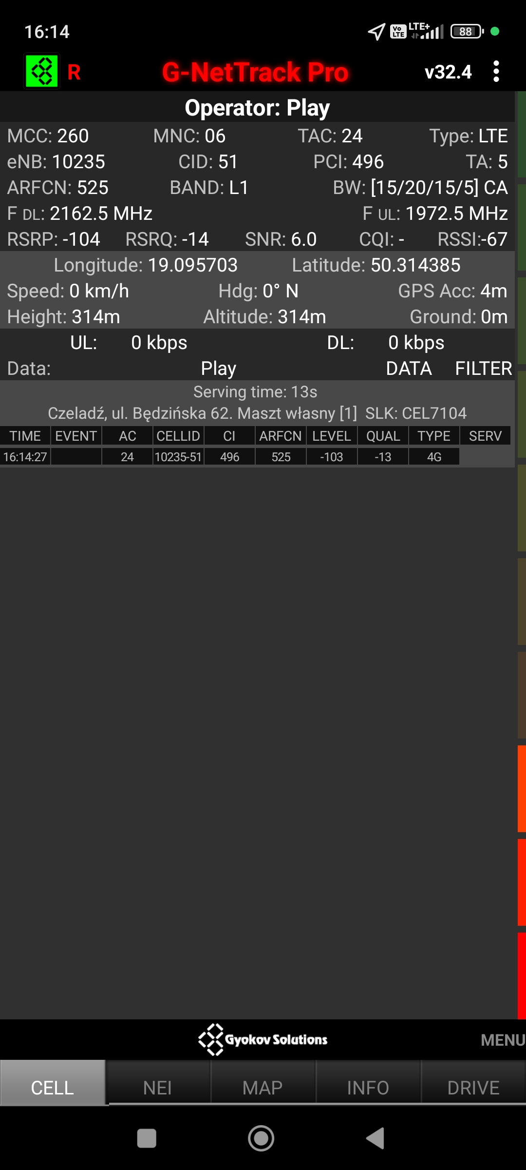Zainteresowanym prezentujemy nietypową stację bazową sieci Play w mieście Czeladź, przy ul. Małobądzkiej 75, nazwa kodowa: CEL7107. Na czas wizytowania naszego redakcyjnego Kolegi z Zagłębia stacja nie działała. Terminal logował się do stacji przy ul. Będzińskiej 62 (wieża własna).