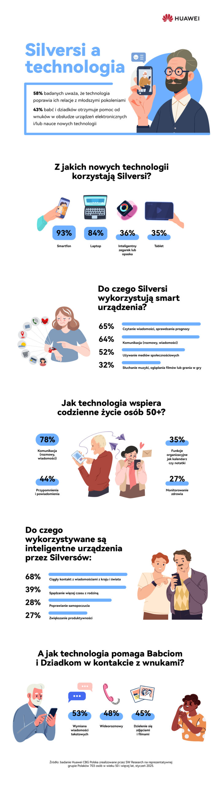 Warszawa, 29 stycznia 2025 r. – Wykluczenie technologiczne Silversów (osób po 50 roku życia) to mit, który można odłożyć na półkę. W Polsce aż 97% osób w tym wieku korzysta z inteligentnych urządzeń. Najczęściej są to smartfony (93% Silversów) i laptopy (84%), a sportowe opaski lub smartwatche posiada 36% z nich – wynika z badania Huawei CBG Polska [1]. Tylko 5% badanych deklaruje, że technologia osłabia ich relacje z młodszymi pokoleniami, a 58% uważa, że je poprawia. Co ciekawe, aż 88% Silversów nie widzi negatywnego wpływu technologii na relacje międzypokoleniowe. Dodatkowo 77% osób będących już dziadkami wskazuje, że technologia pozwala im utrzymywać lepszy kontakt z młodszymi generacjami.