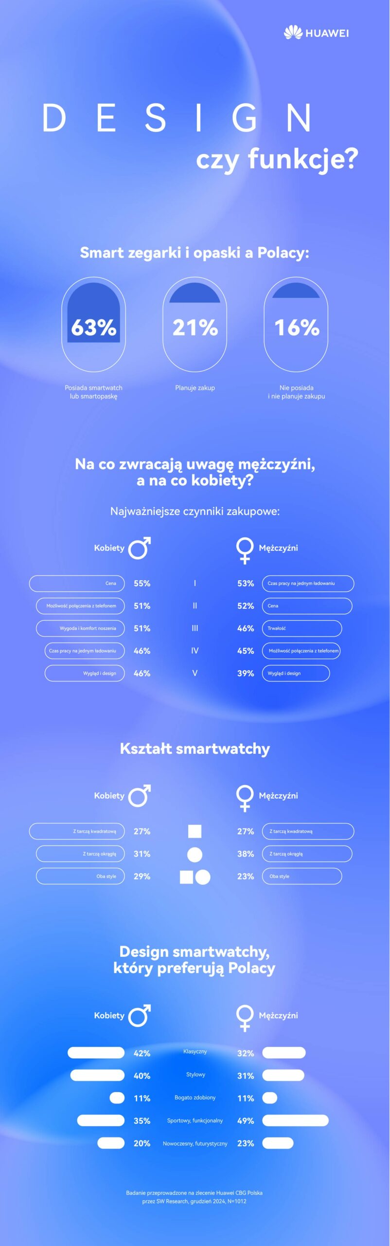 Warszawa, 30 stycznia 2025 r. – Smartwatche i inteligentne opaski to dla Polaków nie tylko użyteczne gadżety, ale możliwość wyrażenia siebie i dopasowania produktu pod własne modowe upodobania. Design smartwatcha odgrywa istotną rolę w decyzjach zakupowych konsumentów – jak wynika z najnowszego badania Huawei CBG Polska [i] wskazuje na niego aż 43% respondentów. Wygląd, materiały, trwałość i wygoda są ważne dla 79% kobiet i 71% mężczyzn. Co ciekawe, cechy niezwiązane z designem znacznie częściej liczą się u kobiet (75%), niż u mężczyzn (62%).