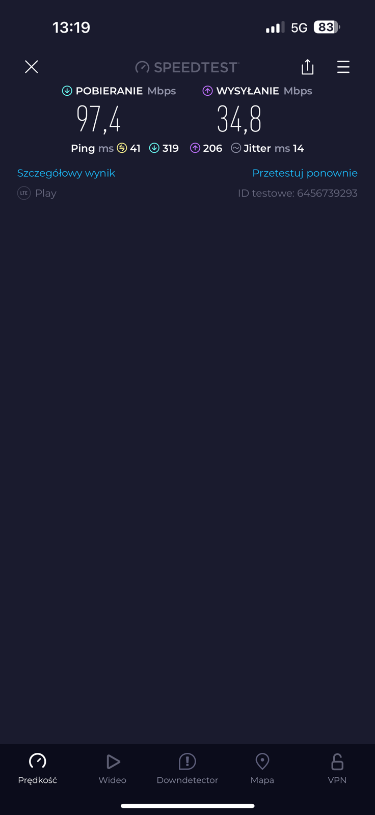3. test speedtest.net dla terminala z kartą SIM Play na zewnątrz (sieć macierzysta)