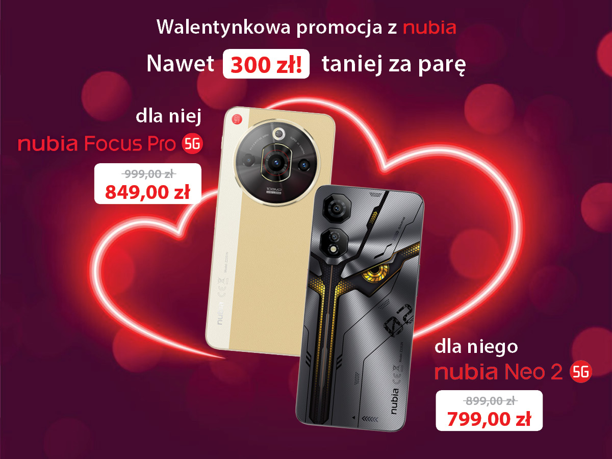 Z okazji Walentynek marka nubia przygotowała wyjątkową promocję na swoje smartfony. Od 1 do 16 lutego br. modele nubia Focus Pro 5G oraz nubia Neo 2 5G możesz kupić taniej – decydując się na parę smartfonów zapłacisz nawet 300 zł mniej! Podarujcie sobie wzajemnie coś wyjątkowego!