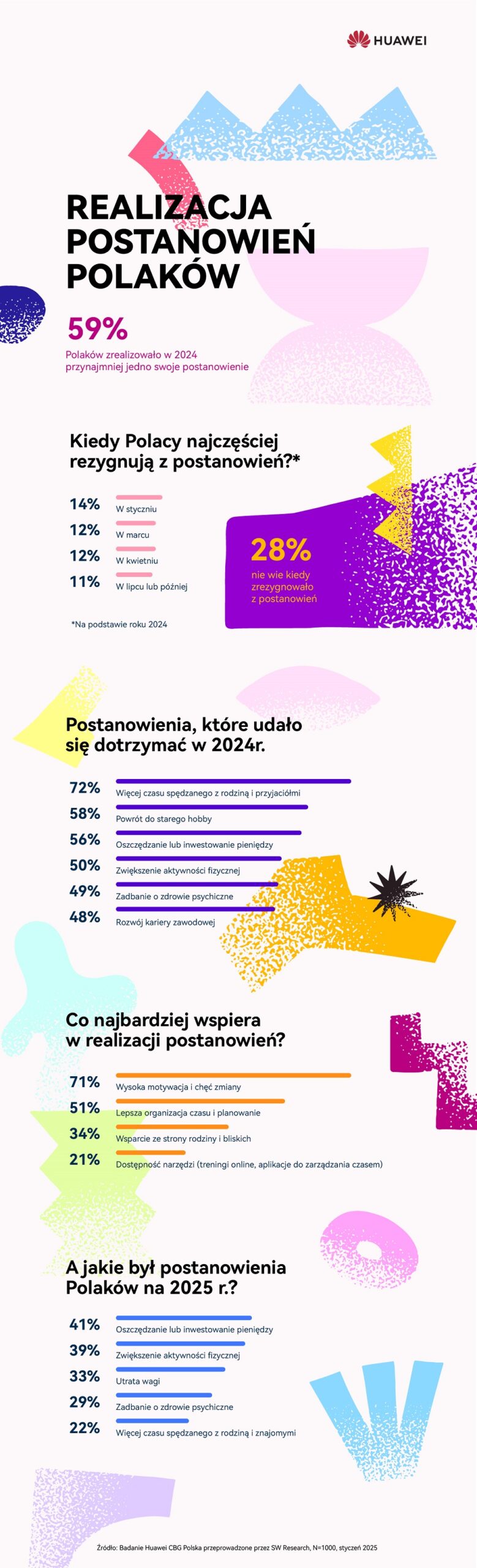 Warszawa, 10 lutego 2025 r. – Polacy chcą być bogatsi, zdrowsi i cieszyć się czasem spędzanym z bliskimi – takie są nasze najpopularniejsze postanowienia na 2025 rok. Badanie Huawei CBG Polska [1] wskazuje, że w najbliższych miesiącach chcemy więcej oszczędzać i inwestować (41%), częściej ćwiczyć (39%), zrzucić wagę (33%), zadbać o zdrowie psychiczne (29%) i spędzać więcej czasu z bliskimi (22%). W 2024 roku aż 81% Polaków miało postanowienia noworoczne, a 72% z nich udało się zrealizować przynajmniej jedno. Jak to wyglądało w praktyce? Spośród osób, które chciały schudnąć, 36% zgubiło kilogramy, a częściej ćwiczyć i zadbać o kondycję psychiczną udało się połowie z tych, którzy wyznaczyli sobie takie cele. Pozostali nawet nie podjęli próby lub odpadali w międzyczasie. Problemem z utrzymaniem postanowień jest brak dyscypliny (48% badanych, którzy nie spełnili postanowienia), utrzymanie długotrwałej motywacji (32%) oraz nadmiar codziennych obowiązków (32%). Jaki cel jest najtrudniejszy w realizacji, co nas motywuje do wytrwania i ile z nas już w styczniu rezygnuje z postanowień? Wchodząc w 2024 rok postanowiliśmy przede wszystkim zadbać o swoje zdrowie i poprawić jakość finansów. Najpopularniejszymi noworocznymi postanowieniami okazały się zwiększenie aktywności fizycznej – 34% oraz oszczędzanie lub inwestowanie pieniędzy, również 34%. Wśród priorytetów znalazły się także utrata wagi 31%, zmiana nawyków żywieniowych 29% i zadbanie o kondycję swojej psychiki 27%, co wskazuje na rosnącą świadomość znaczenia zdrowego stylu życia. Ponad 1/5 z nas (22%) chciało wzmocnić więzi z bliskimi, spędzając więcej czasu z rodziną i przyjaciółmi.