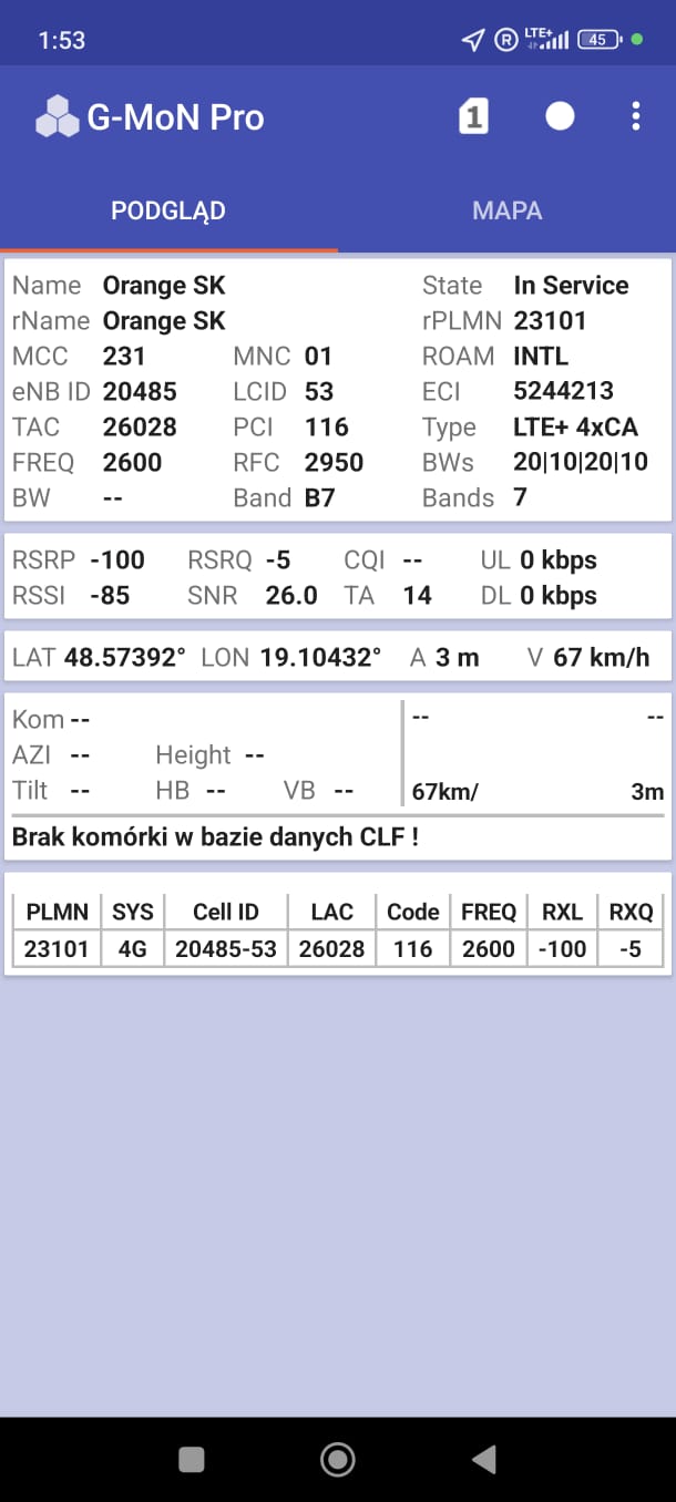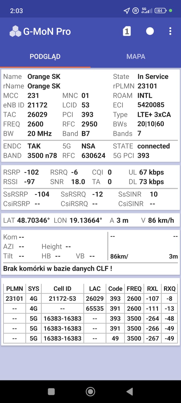 Jak widać ze zrzutu aplikacji G-Mon Pro, operator do którego sieci zalogowała się w trybie automatycznym karta SIM – ma dla 5G band n78 – 60MHz wydzielonego pasma, czyli o 40MHz mniej, aniżeli operatorzy w Polsce.