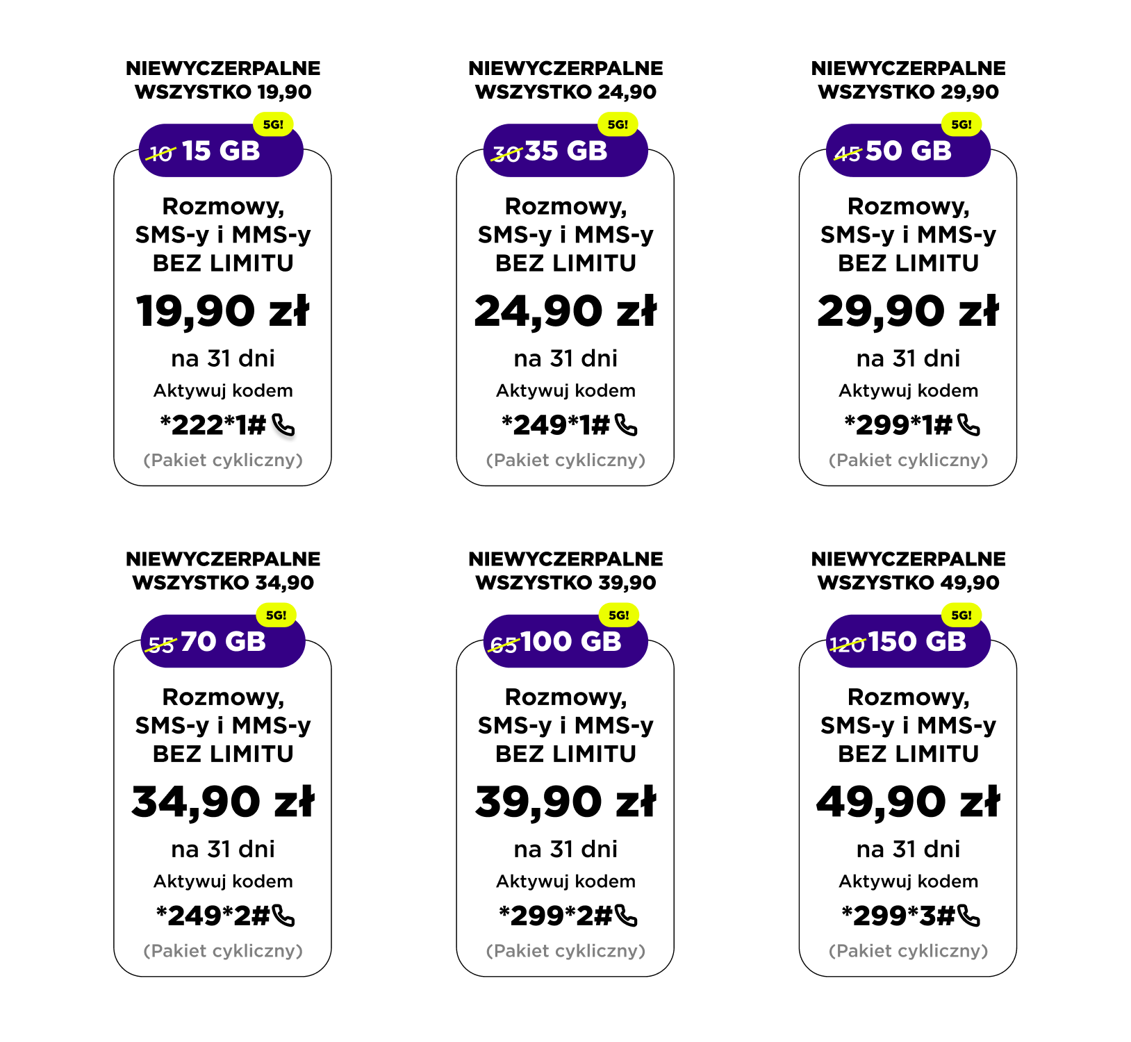 Nowi Klienci otrzymają w prezencie Pakiet Niewyczerpalne Wszystko o wartości 34,90 zł zupełnie za darmo przez 31 dni! Pakiet obejmuje nielimitowane rozmowy, SMS-y i MMS-y oraz 70 GB Internetu. Pakiet aktywuje się automatycznie po aktywacji numeru.