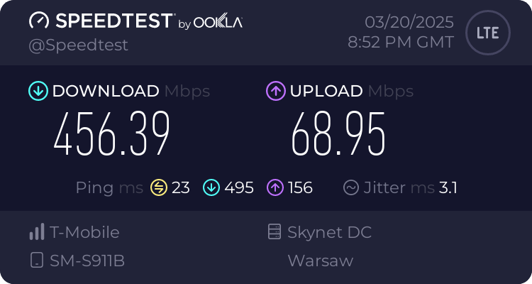Może dlatego że oni mają aż 60 mhz pasma dla 3CC CA 😁 W PL mamy dla konfiguracji 3CA max 20+15+15 dla Polkomtela 20+15+20. Mam właśnie całkowicie blisko stację gdzie leci ponad 400 niezależnie od pory dnia w Sopocie.