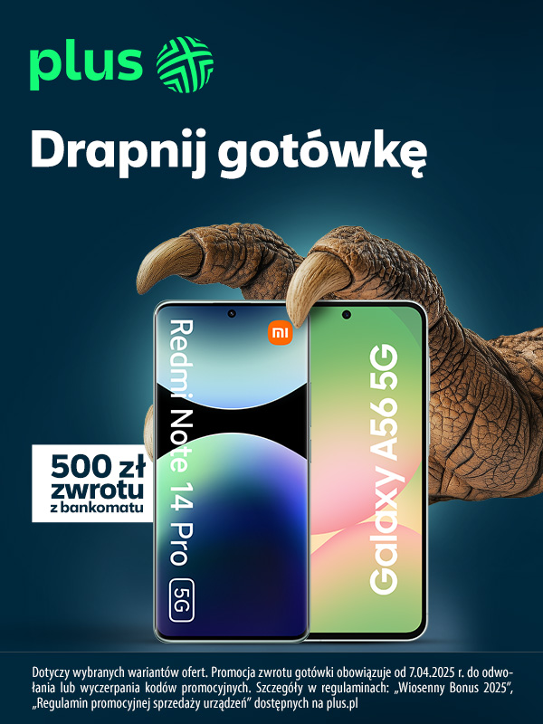 Wiosenna oferta od Plusa to okazja do zatrzymania w portfelu 500 zł. Wystarczy kupić Samsung Galaxy A56 lub Xiaomi Redmi Note 14 Pro, a następnie odebrać gotówkę z bankomatu. Z oferty można skorzystać do 4.05 br. Wiosna to czas, który kojarzy się z remontami, porządkami w ogrodzie czy pierwszymi wyjazdami. Na ich realizację można przeznaczyć pieniądze zaoszczędzone przy zakupie smartfona w specjalnej ofercie od Plusa. Telefony uprawniające do odebrania gotówki to tegoroczne nowości. Samsung Galaxy A56 5G jest propozycją dla tych, którzy szukają telefonu o wysokich parametrach technicznych, adekwatnych do obowiązujących trendów, ale w atrakcyjnej cenie. Xiaomi Redmi Note 14 Pro zachęca natomiast designem, dobrej jakości aparatem w równie przystępnym przedziale cenowym. Teraz zakup powyższych modeli jest szczególnie opłacalny.